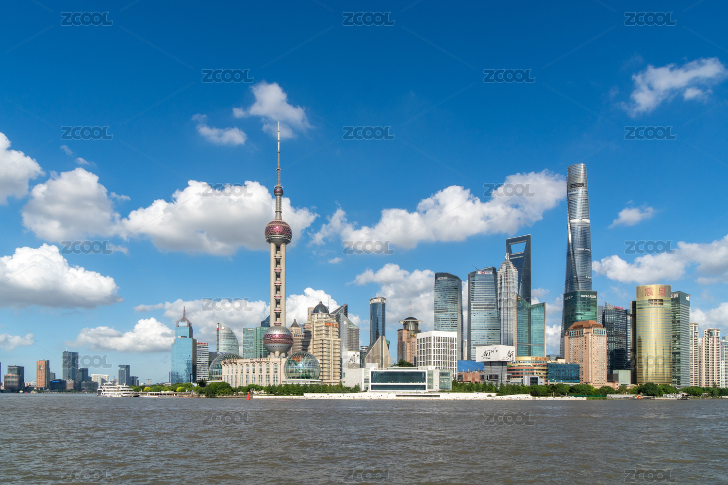 中国上海晴朗天气下的建筑和黄浦江河流风光