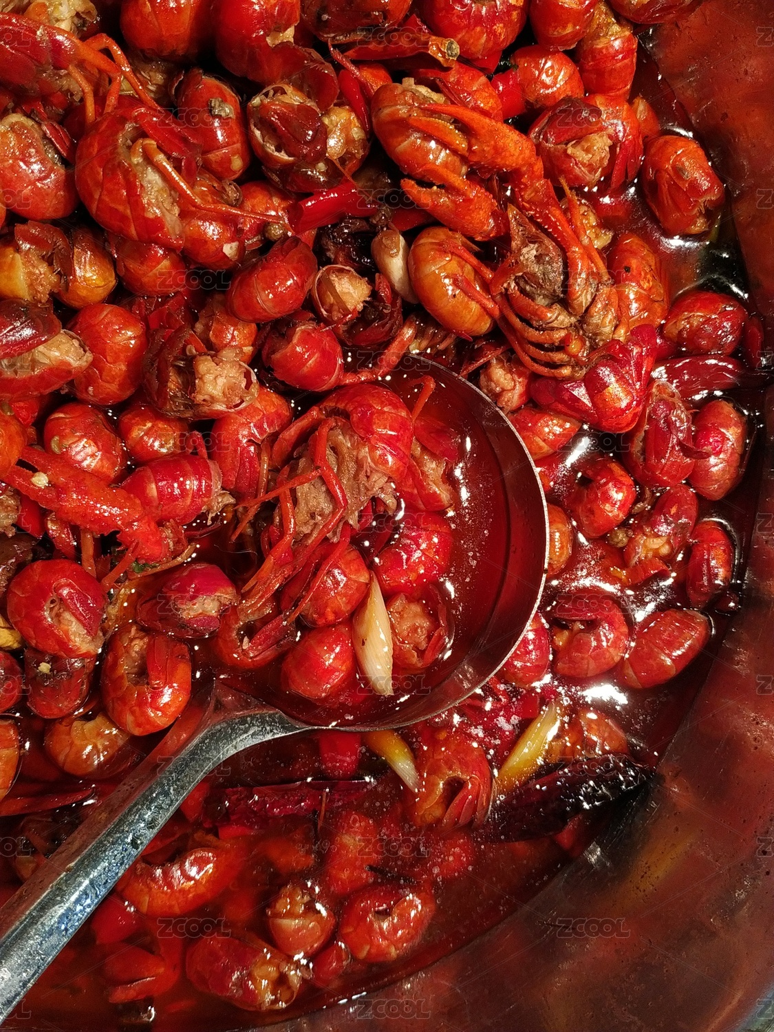 锅中的红烧小龙虾特写镜头