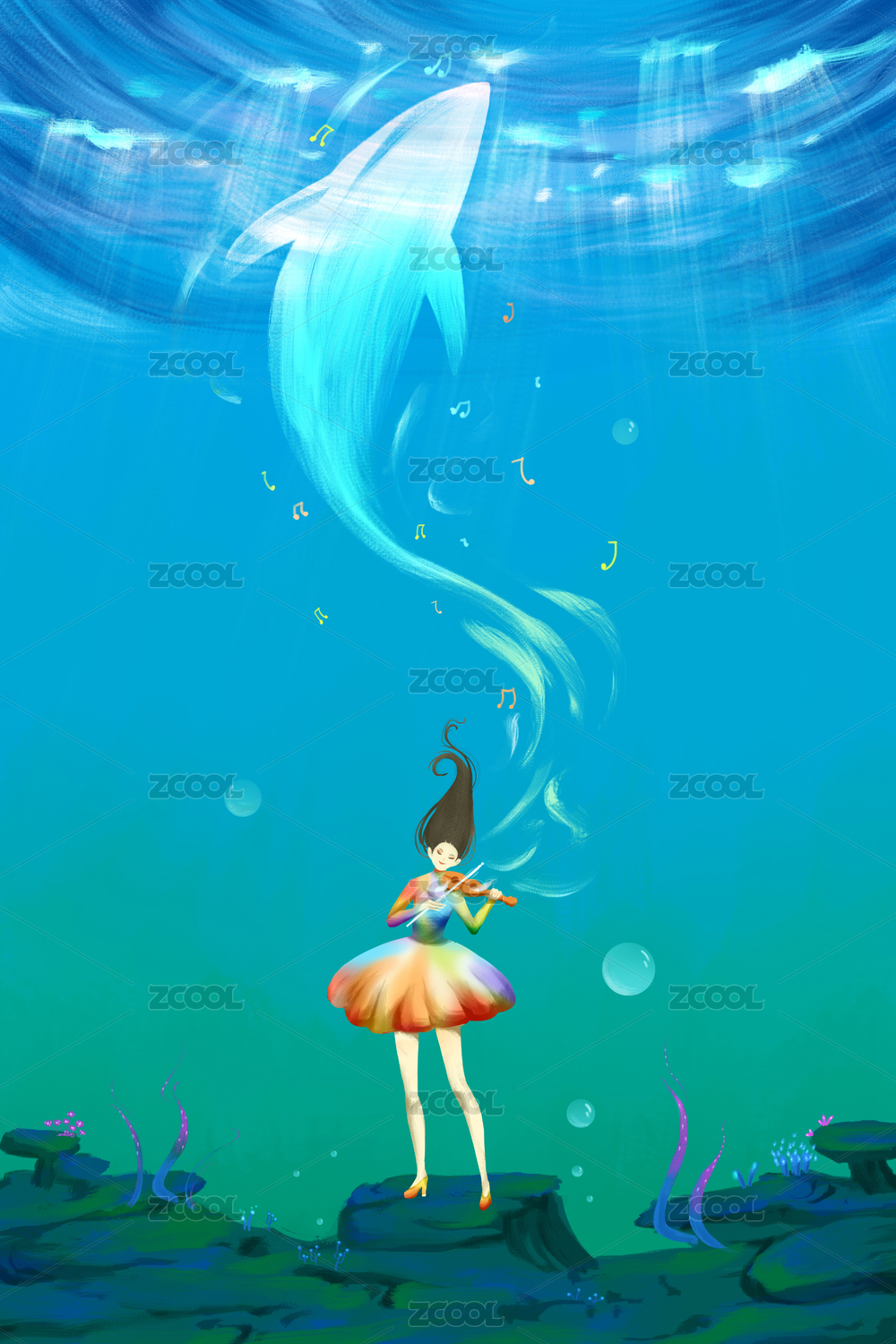 在海底拉小提琴的女孩超现实插画
