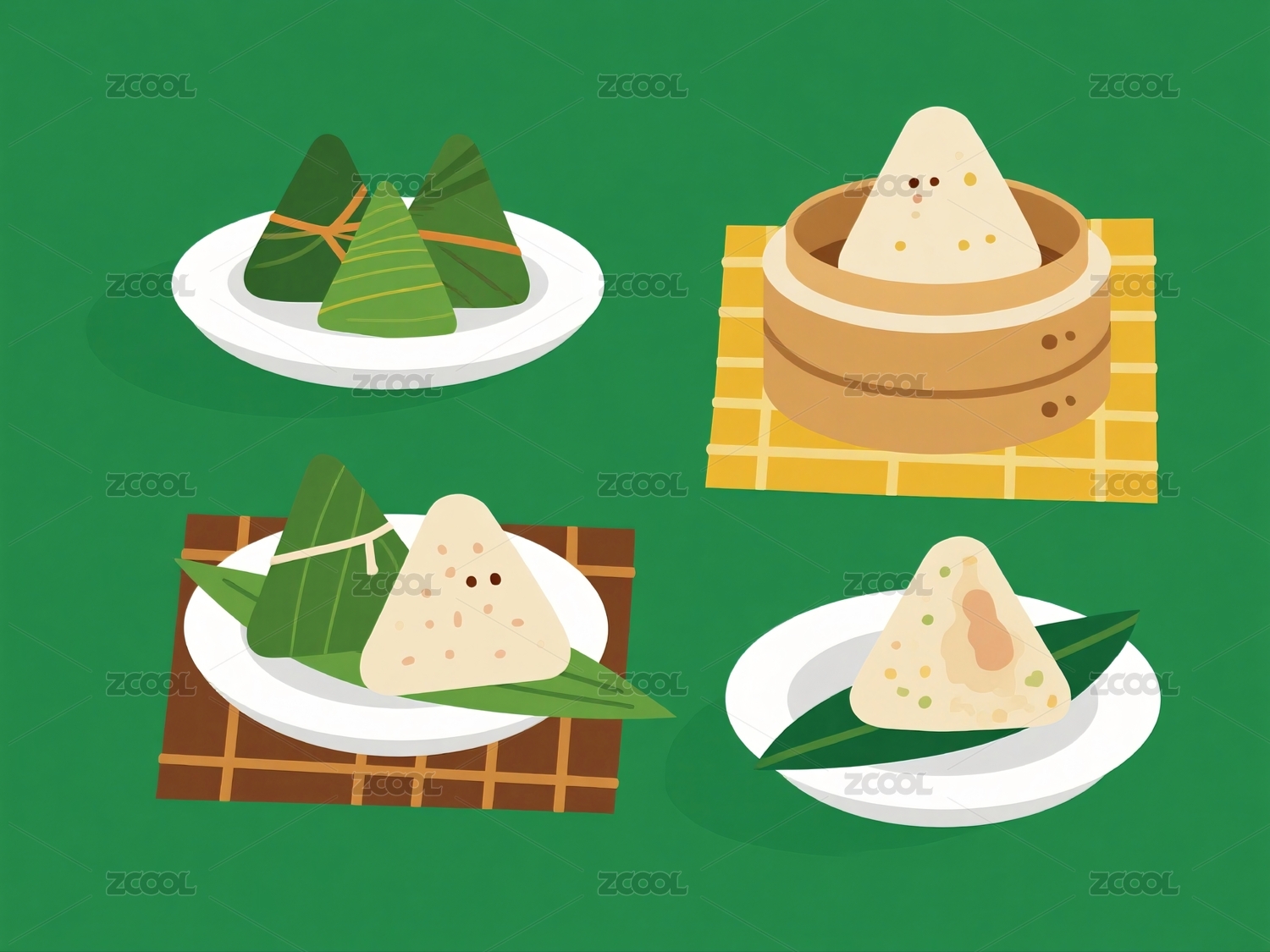 端午节包粽子和糯米红枣红豆鸭蛋插画圆形
