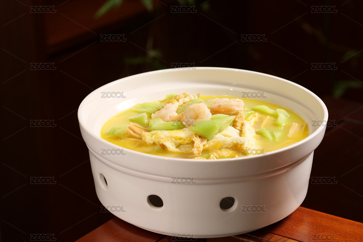 彩椒丝瓜浓汤冬笋花胶烩大虾