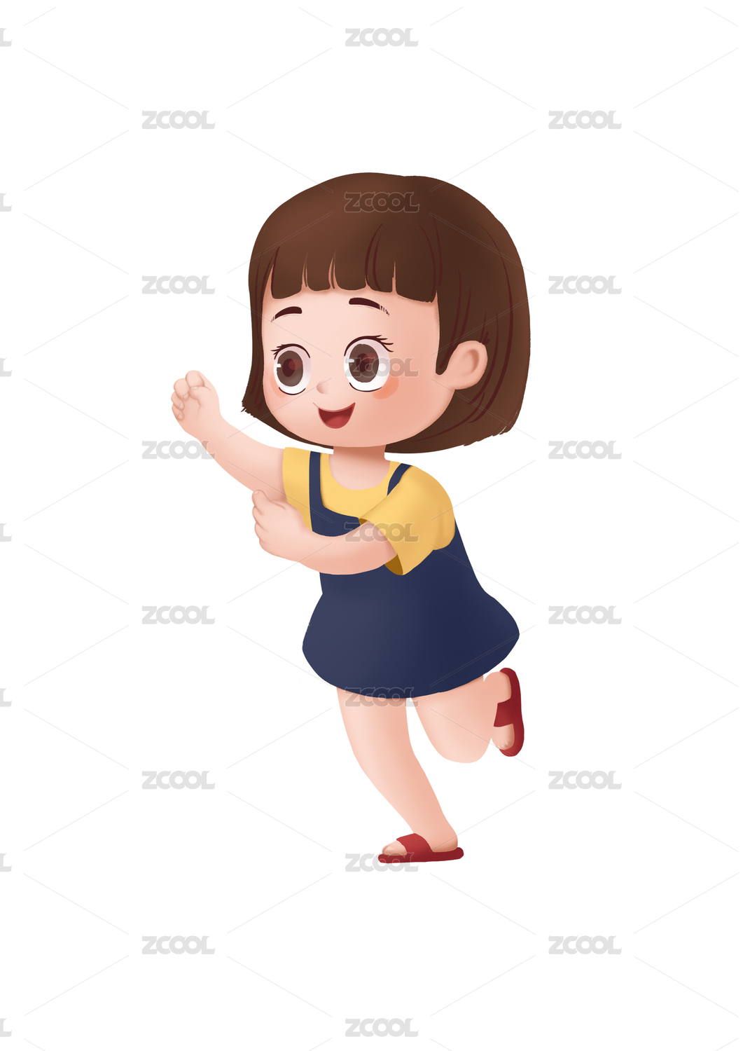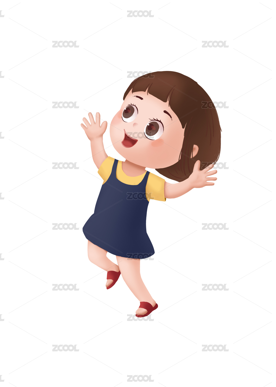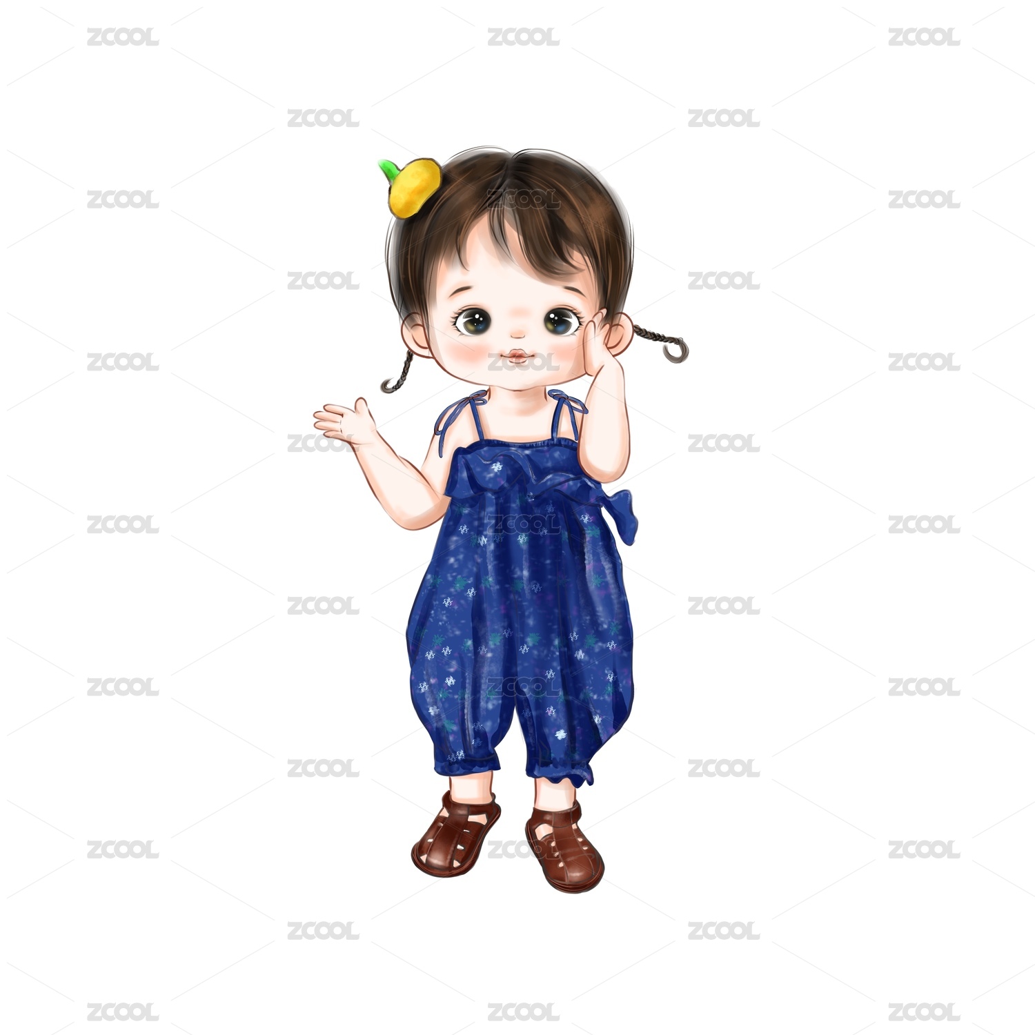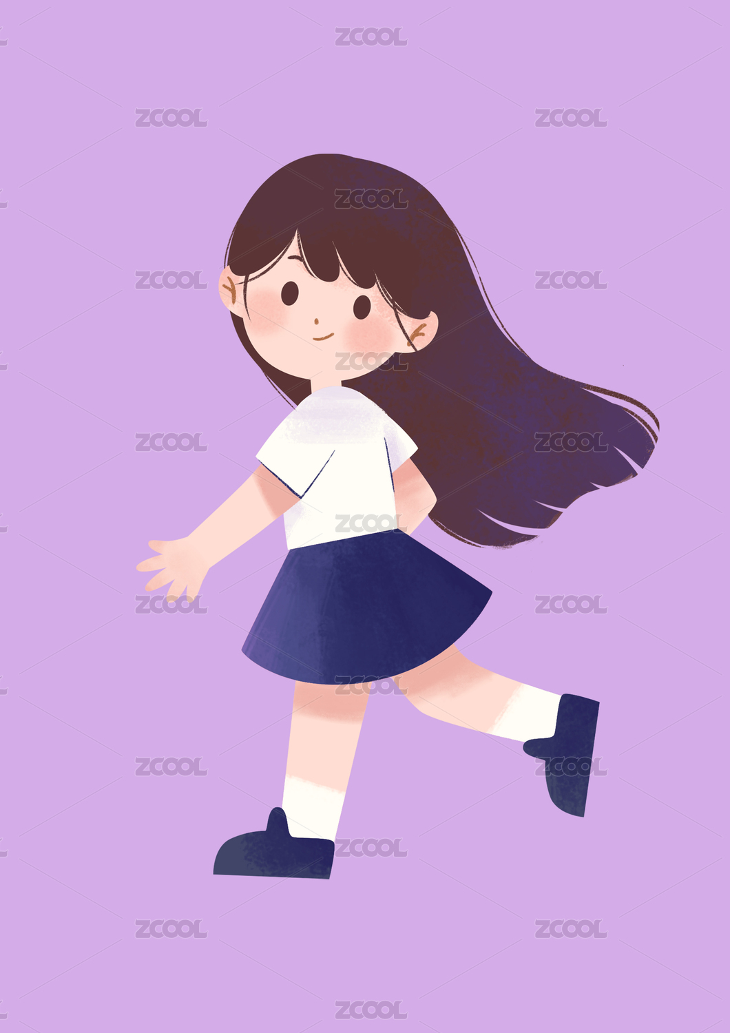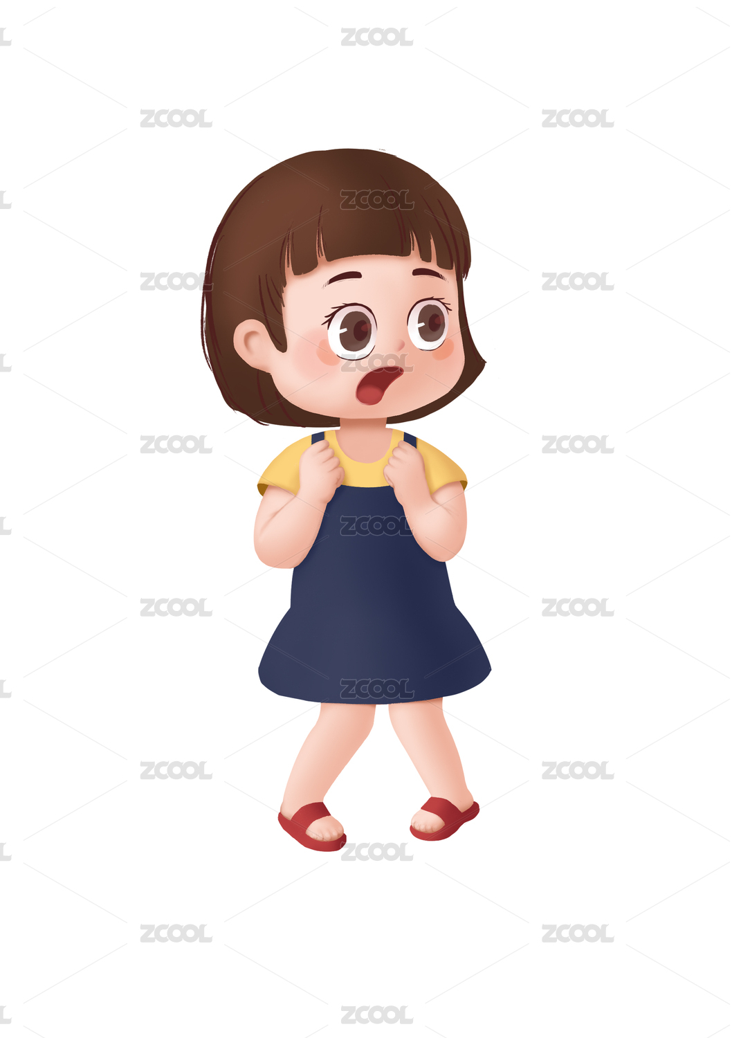 马尾辫和裙子的卡通女孩站着思考高清图片