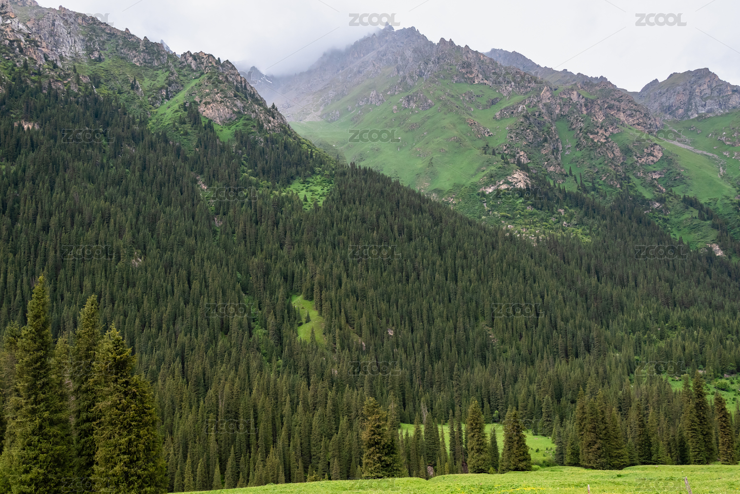 中国新疆下塔风景区雄伟的山脉和绿色的草原