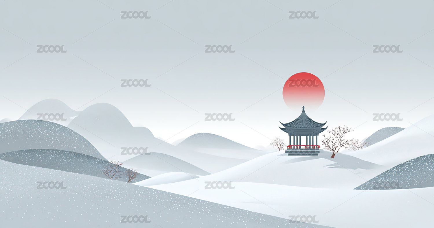 雪中山峦与红日亭台