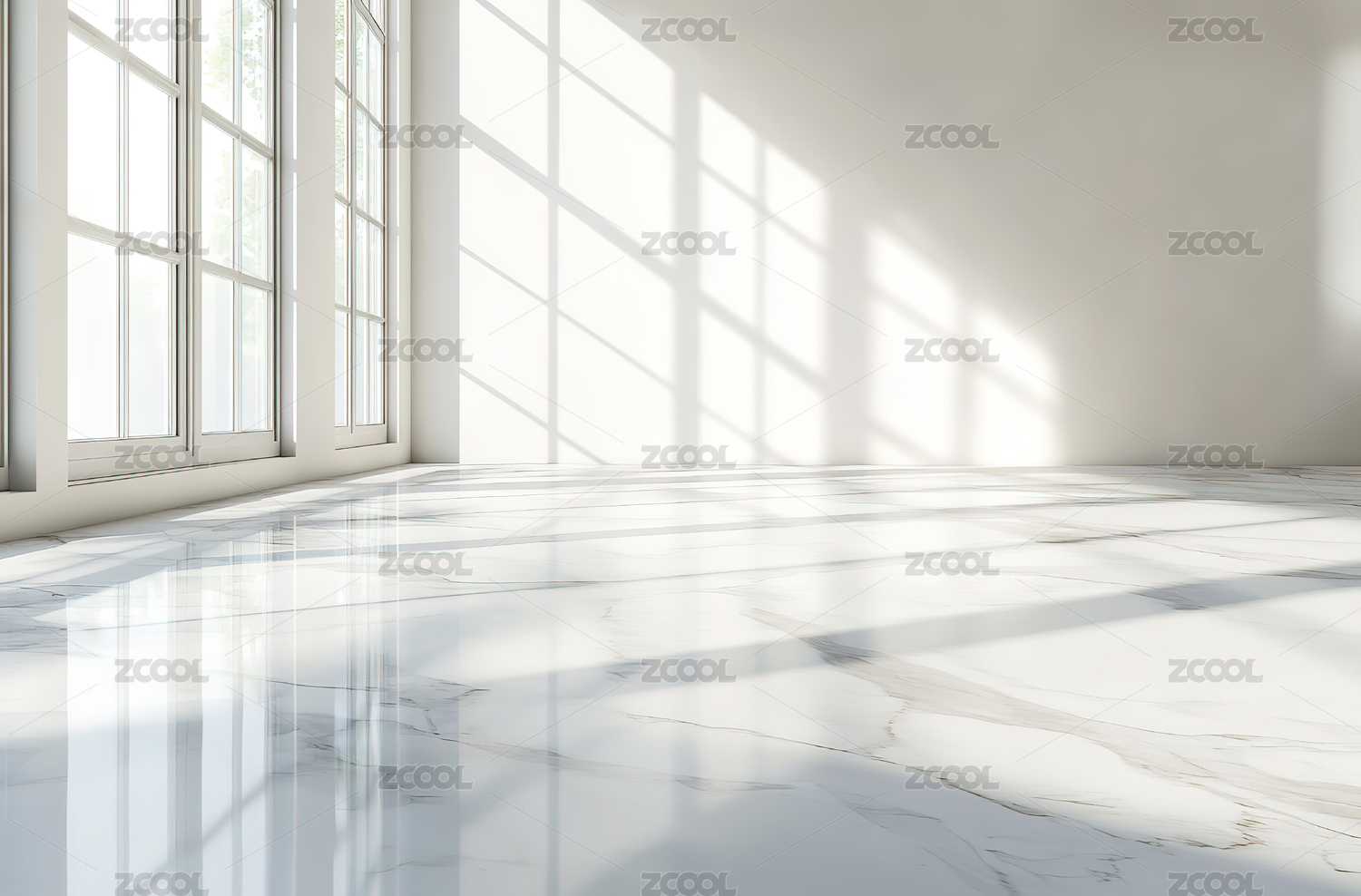 白色的房间,有窗户,地板上有阴影