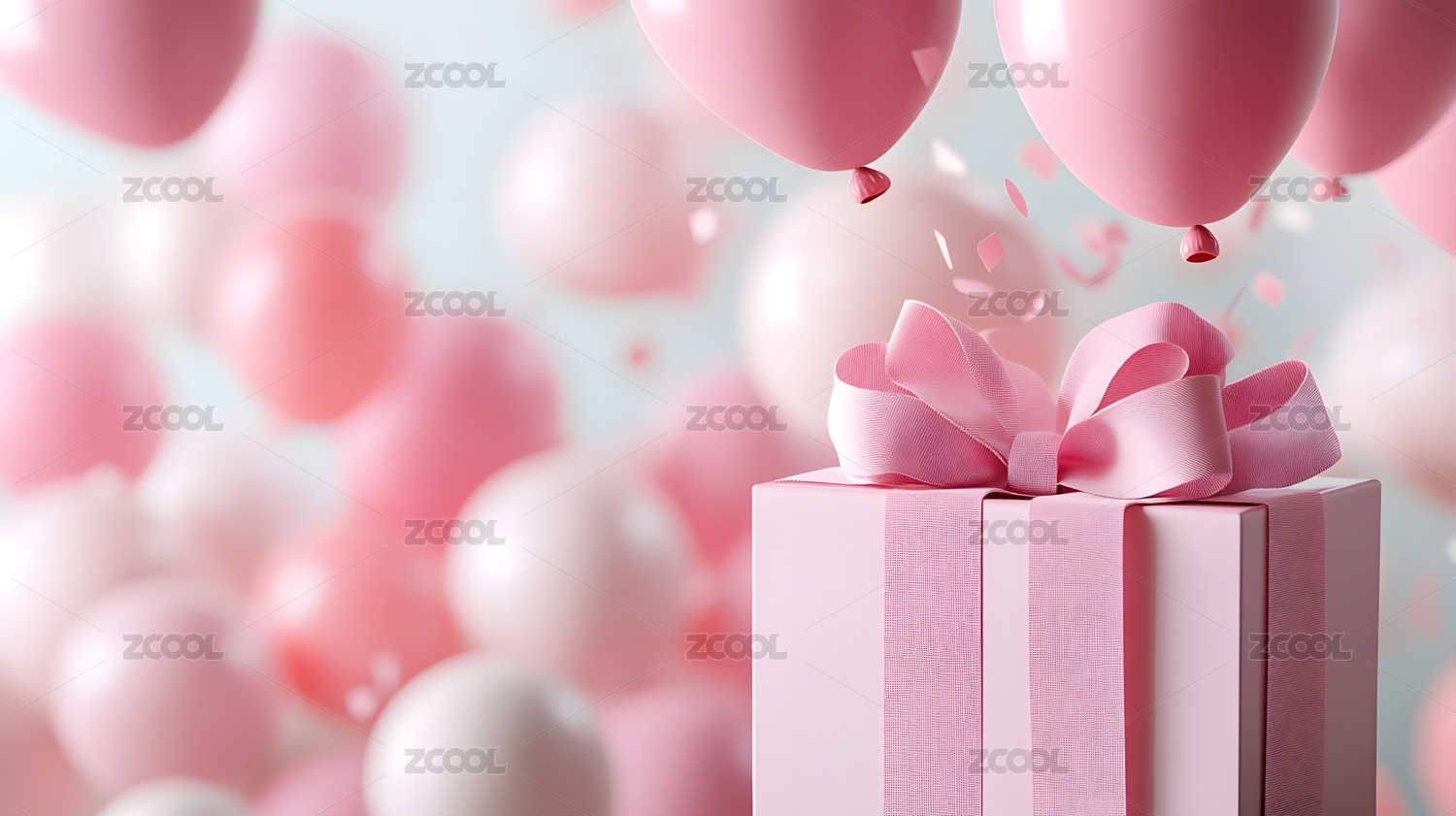 绑着丝带礼品盒周围漂浮着粉色蓝色的气球