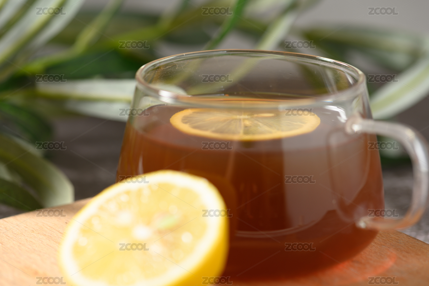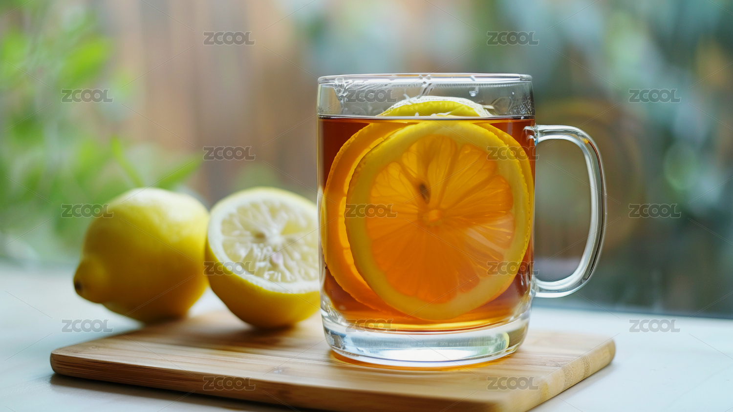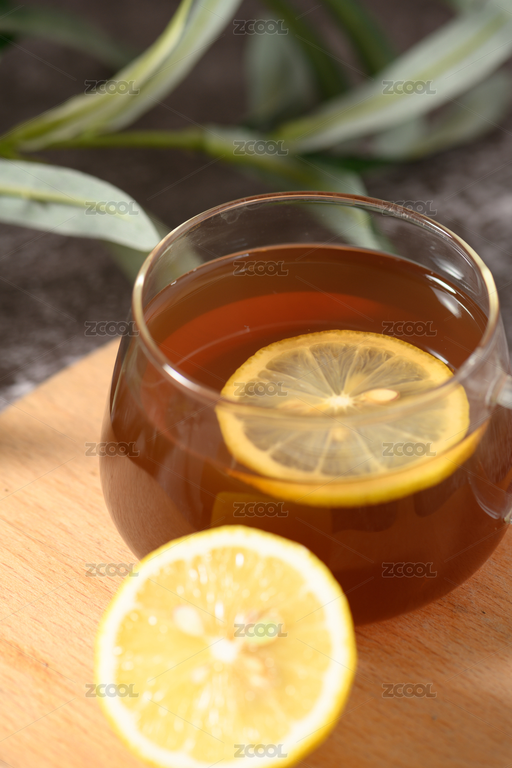 桌面上的木砧板上的玻璃杯子里的柠檬红茶