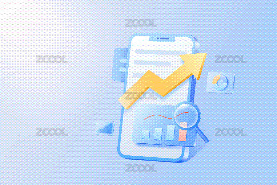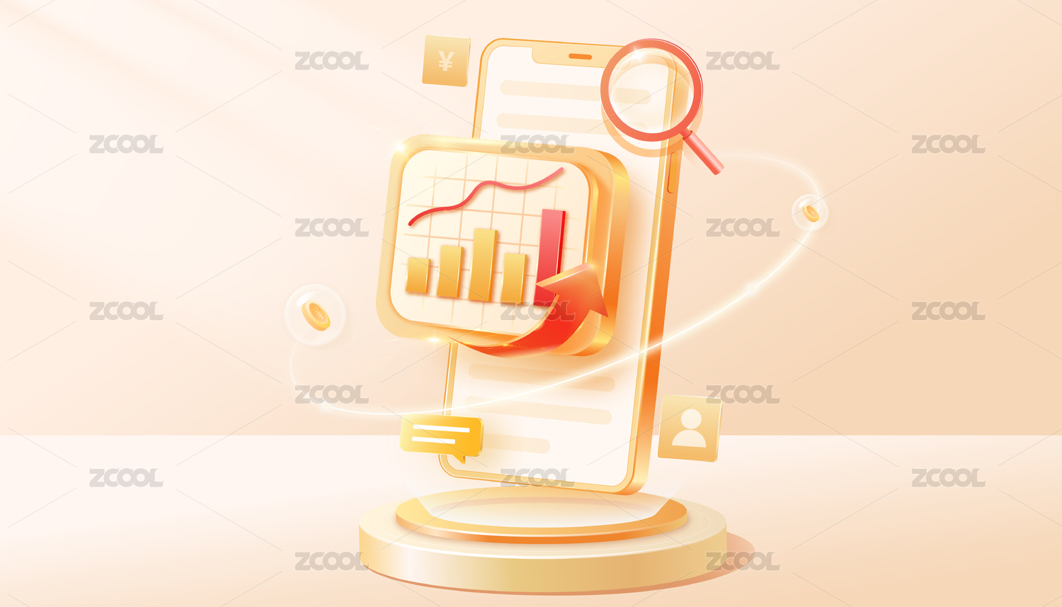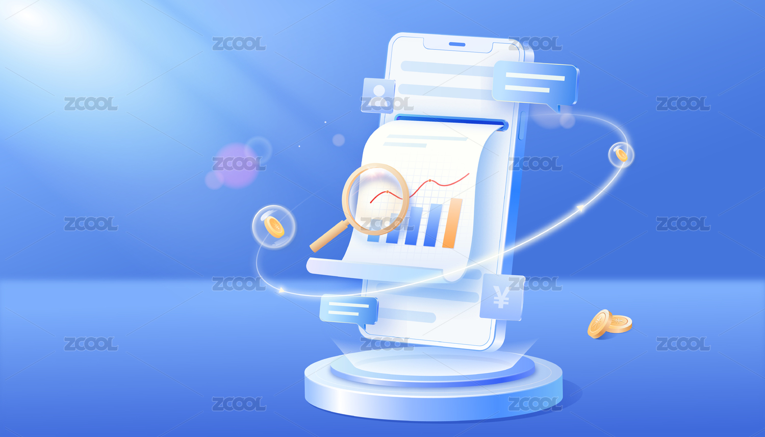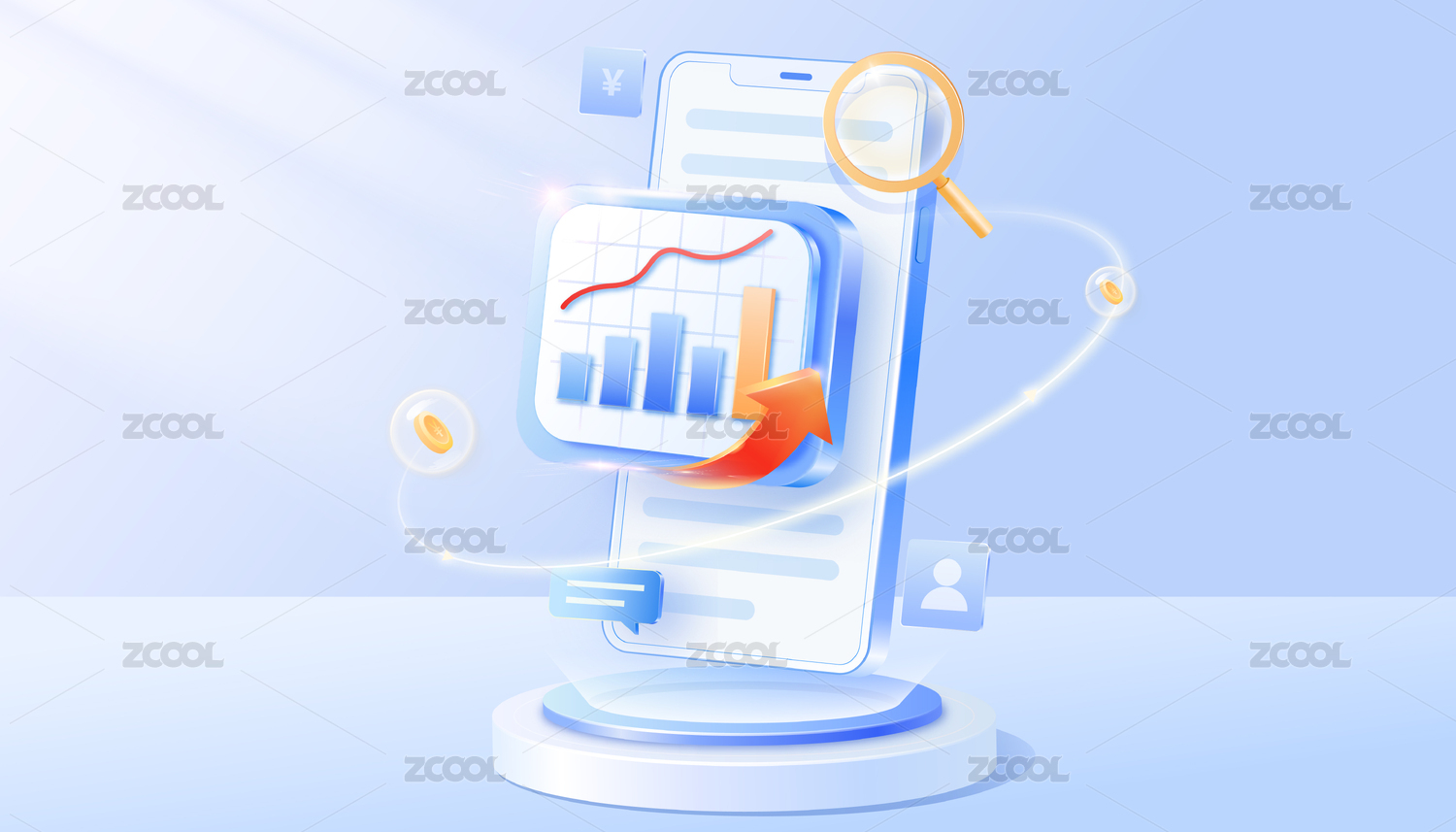 手机,放大镜,金币,饼图,柱状图,上涨,箭头,银行,银行卡,折线图