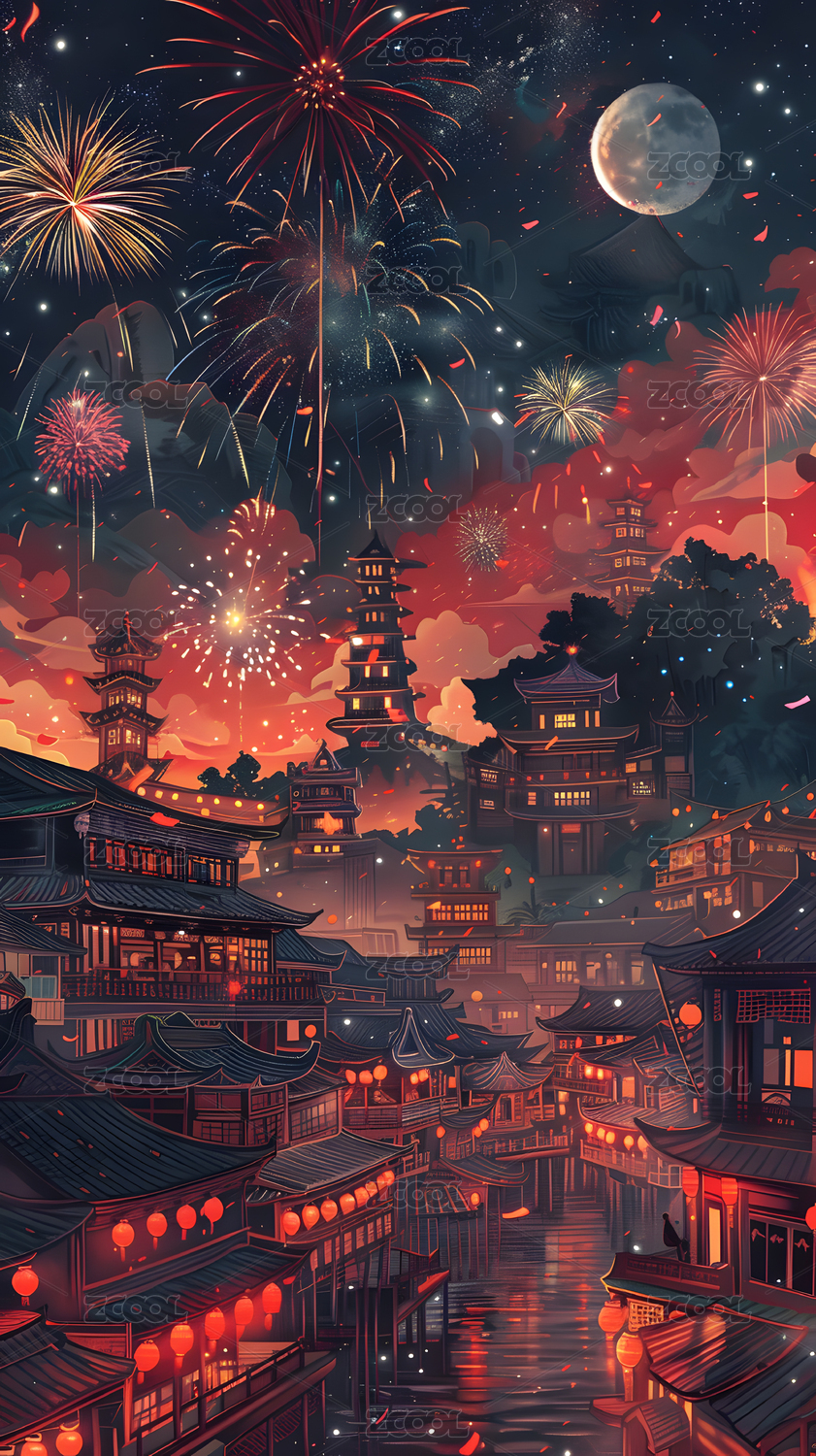 国潮风春节节日古镇建筑上空烟花插画