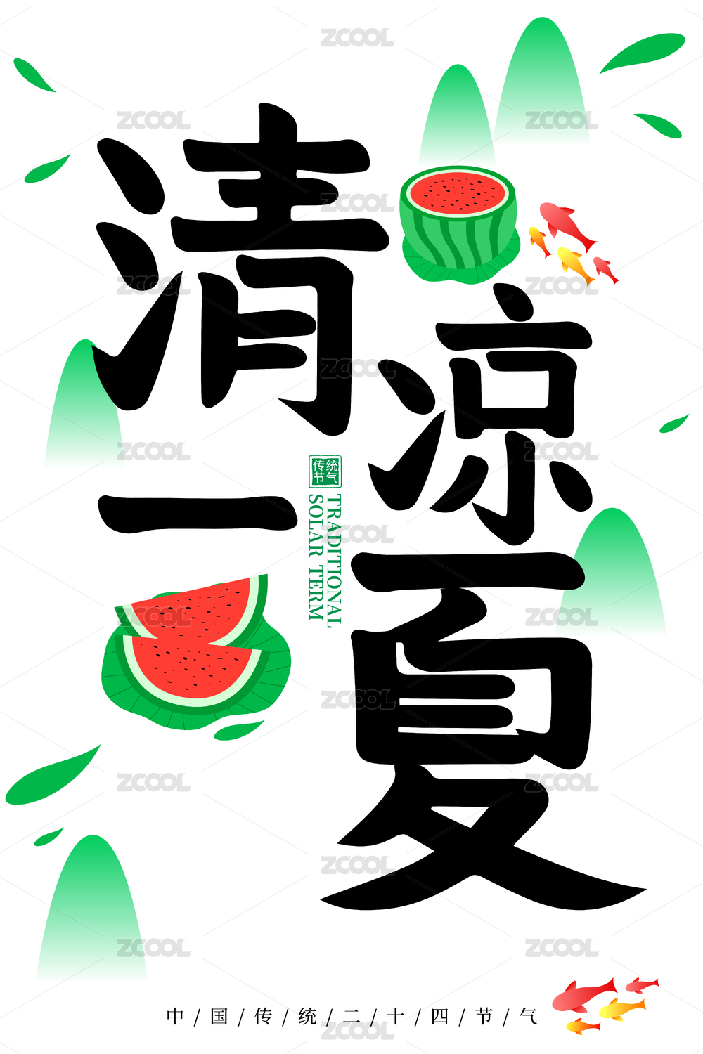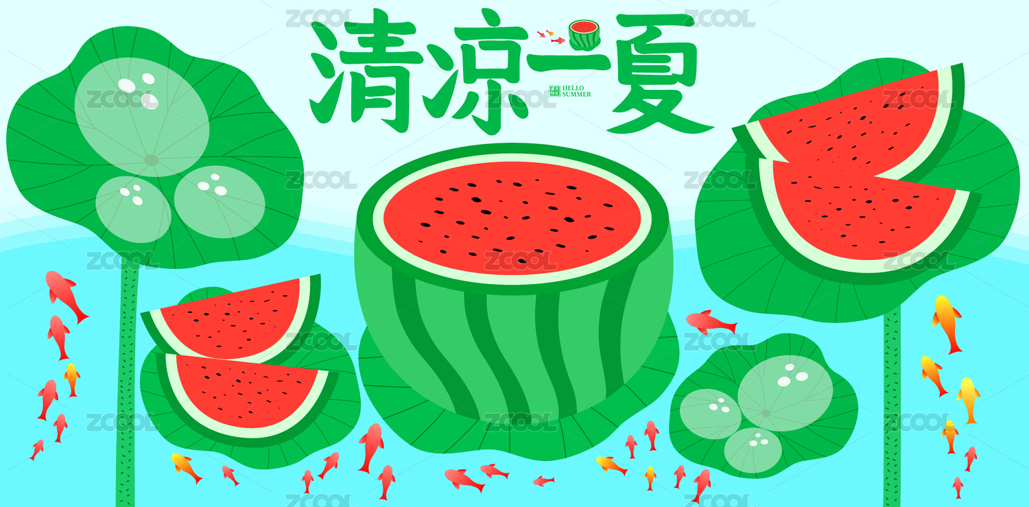 清凉一夏清新荷叶西瓜锦鲤矢量插画