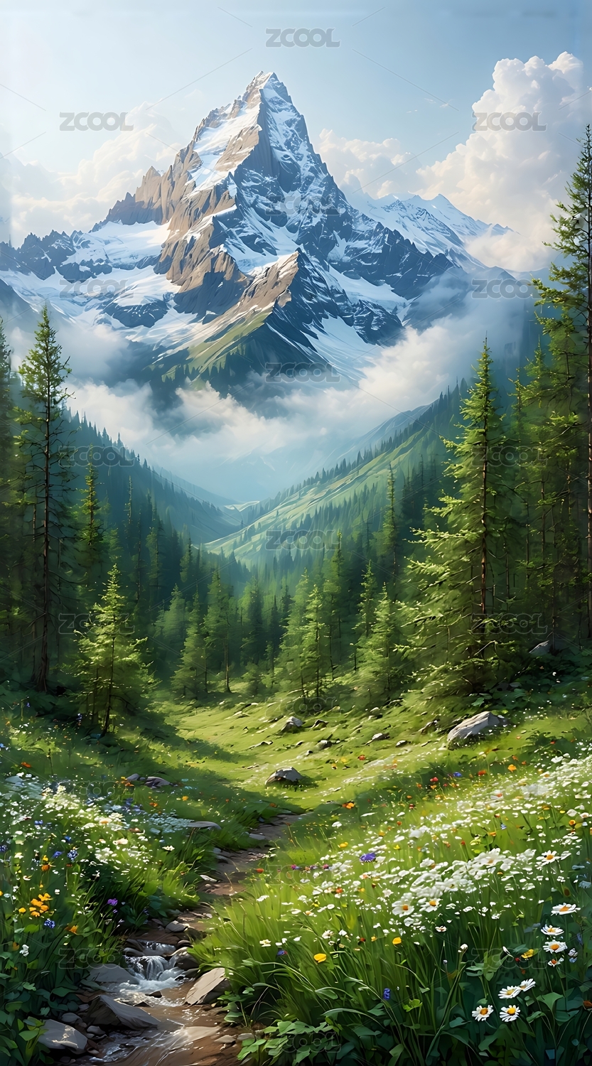 雾锁山峦的壮丽景色 溪流与雪山的宁静交响