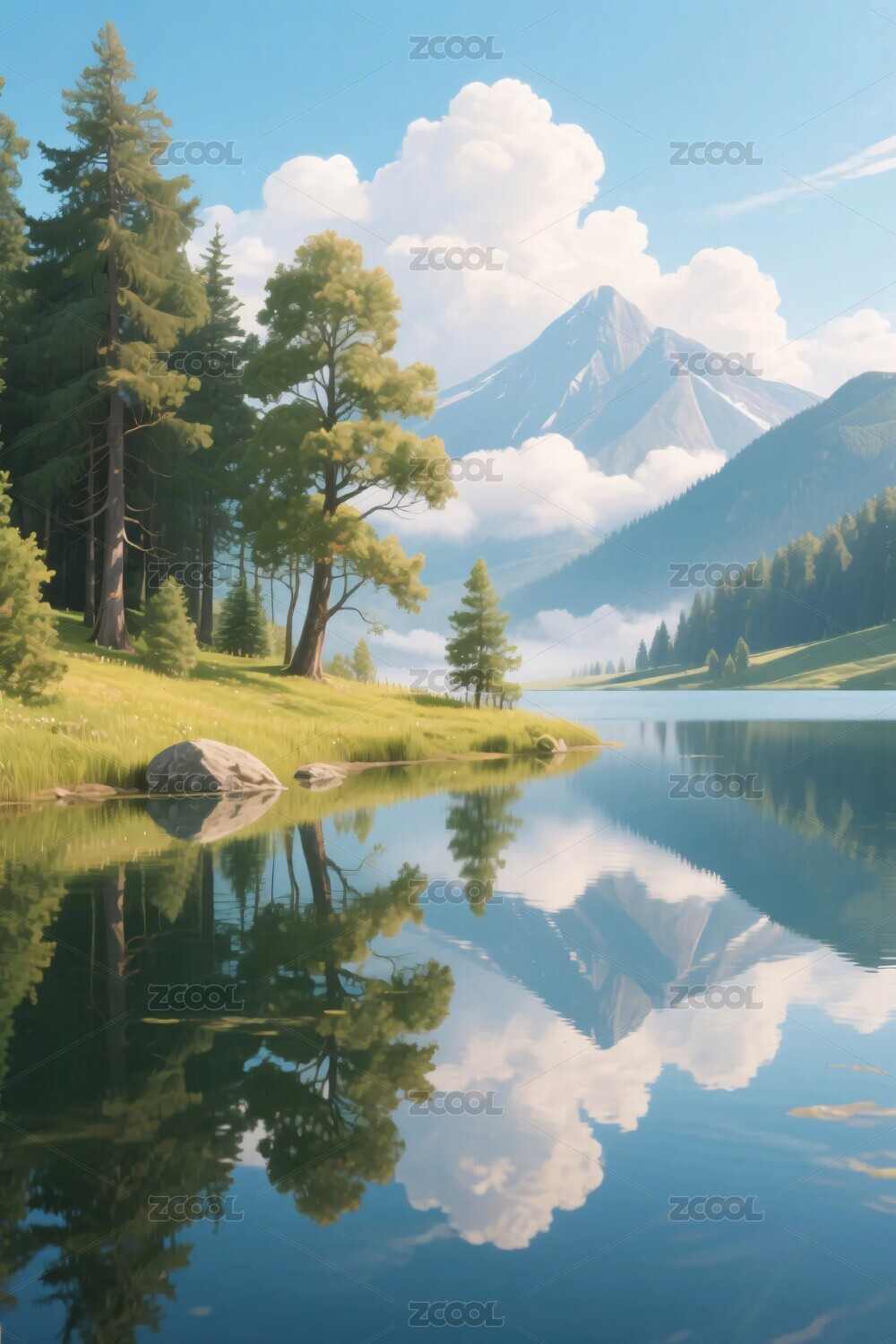 山脉,河流,树木,金色,风景,自然,插画,背景,壁纸,3D