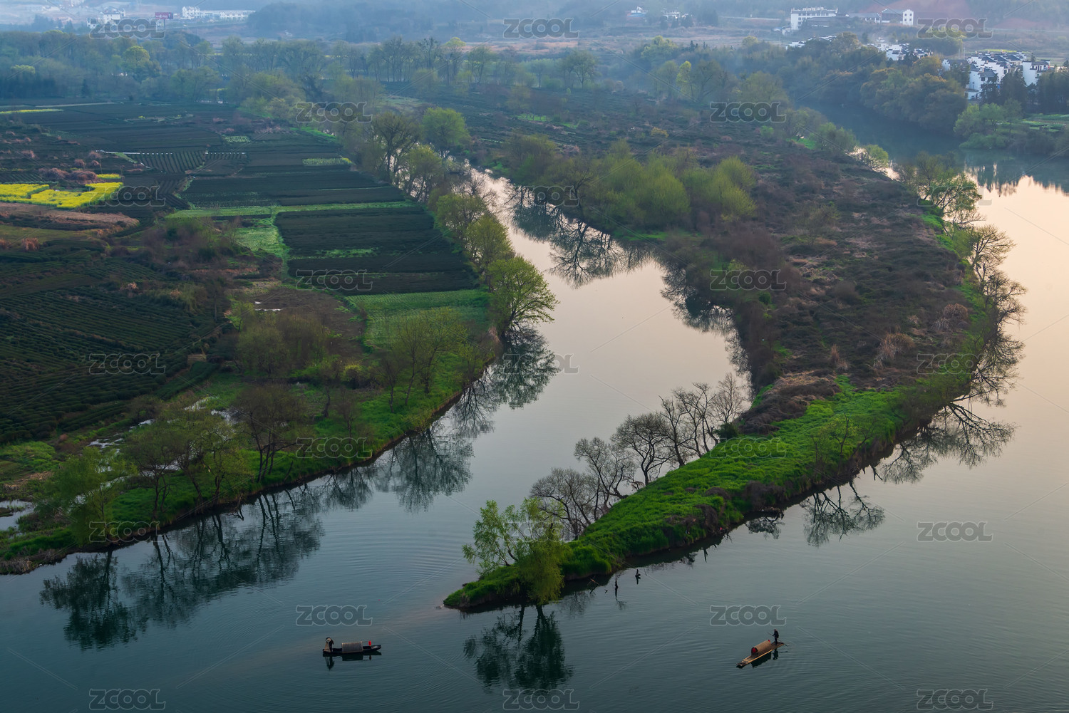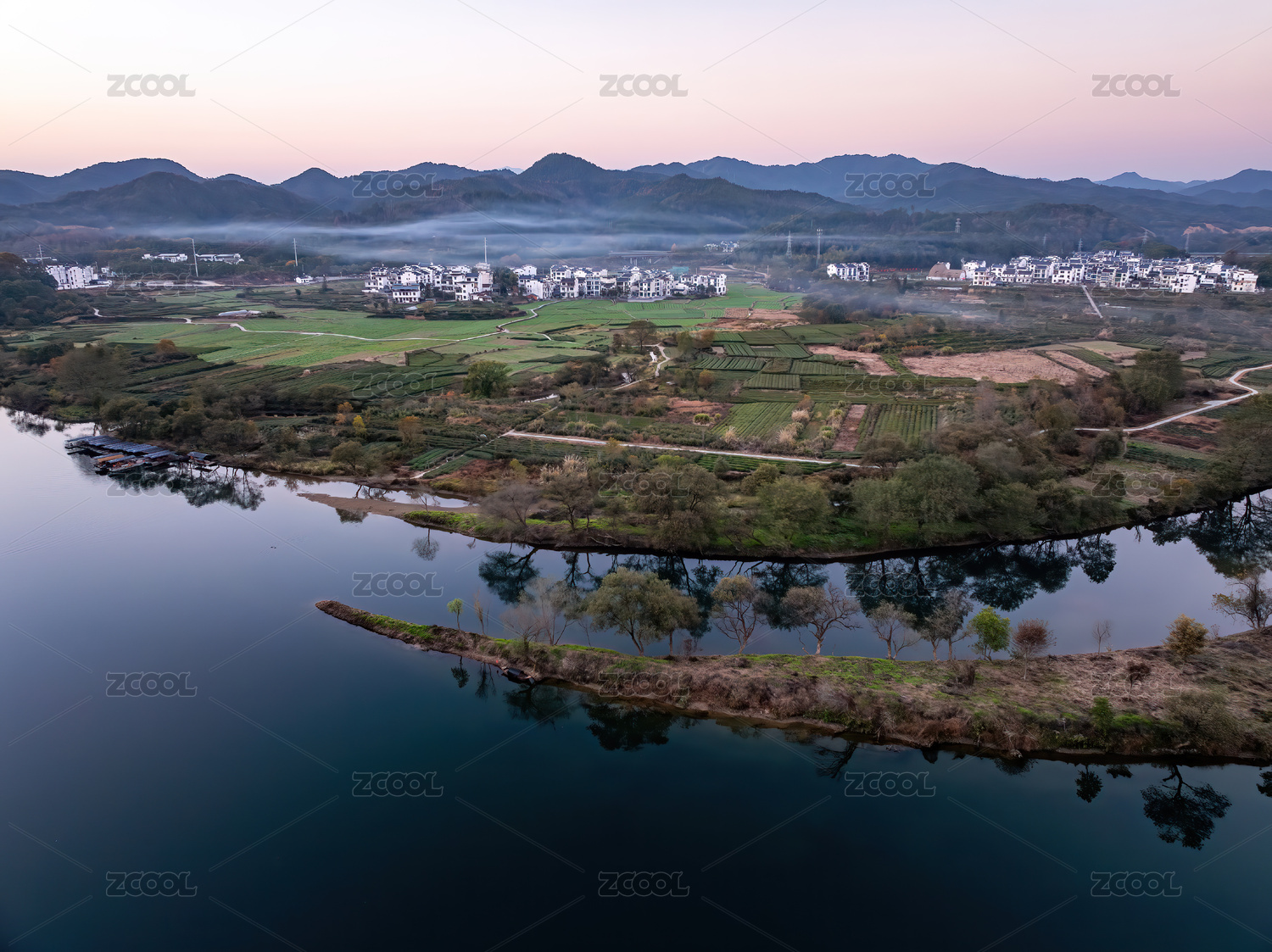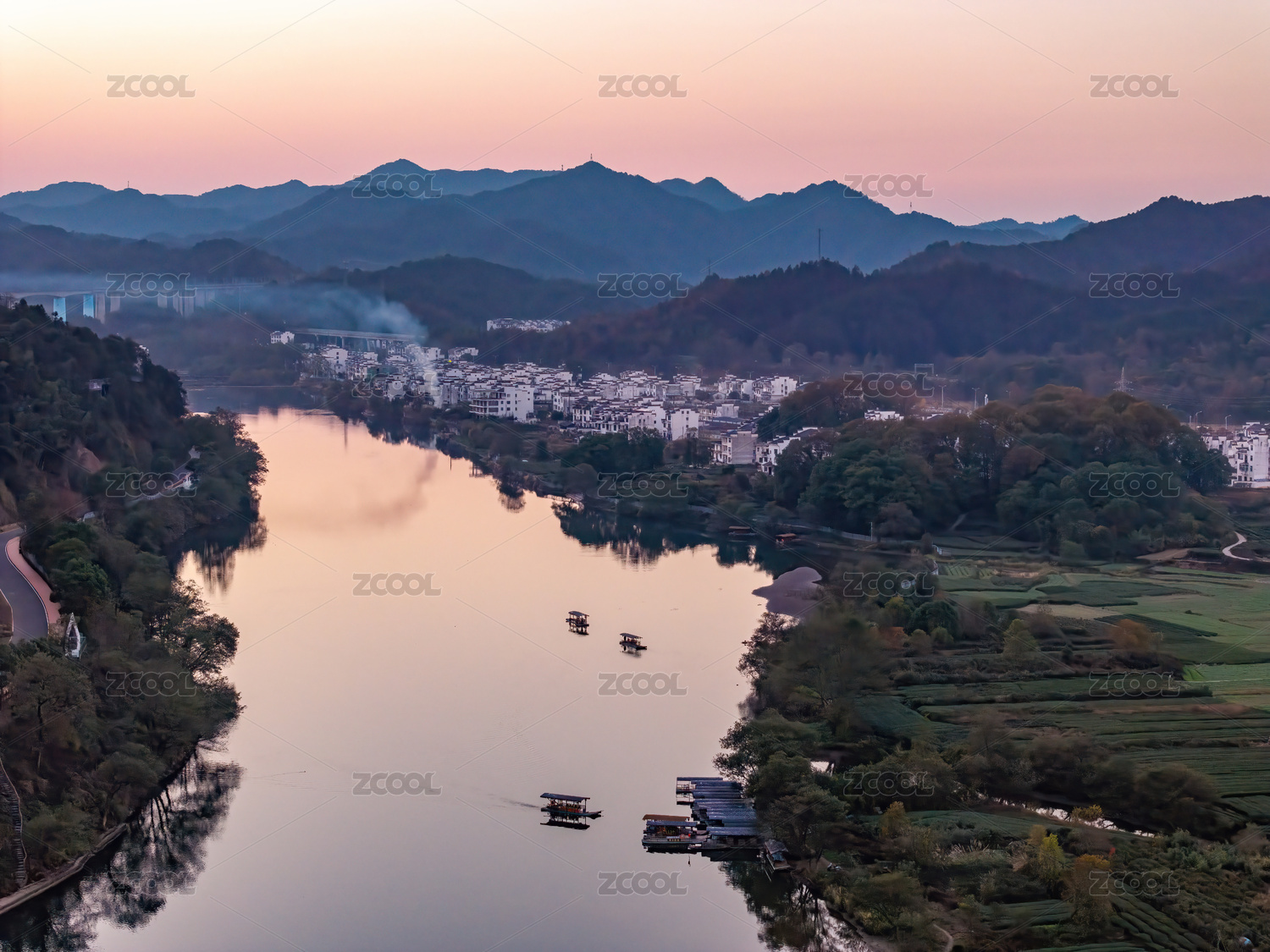 江西上饶婺源月亮湾游船日落晨雾航拍