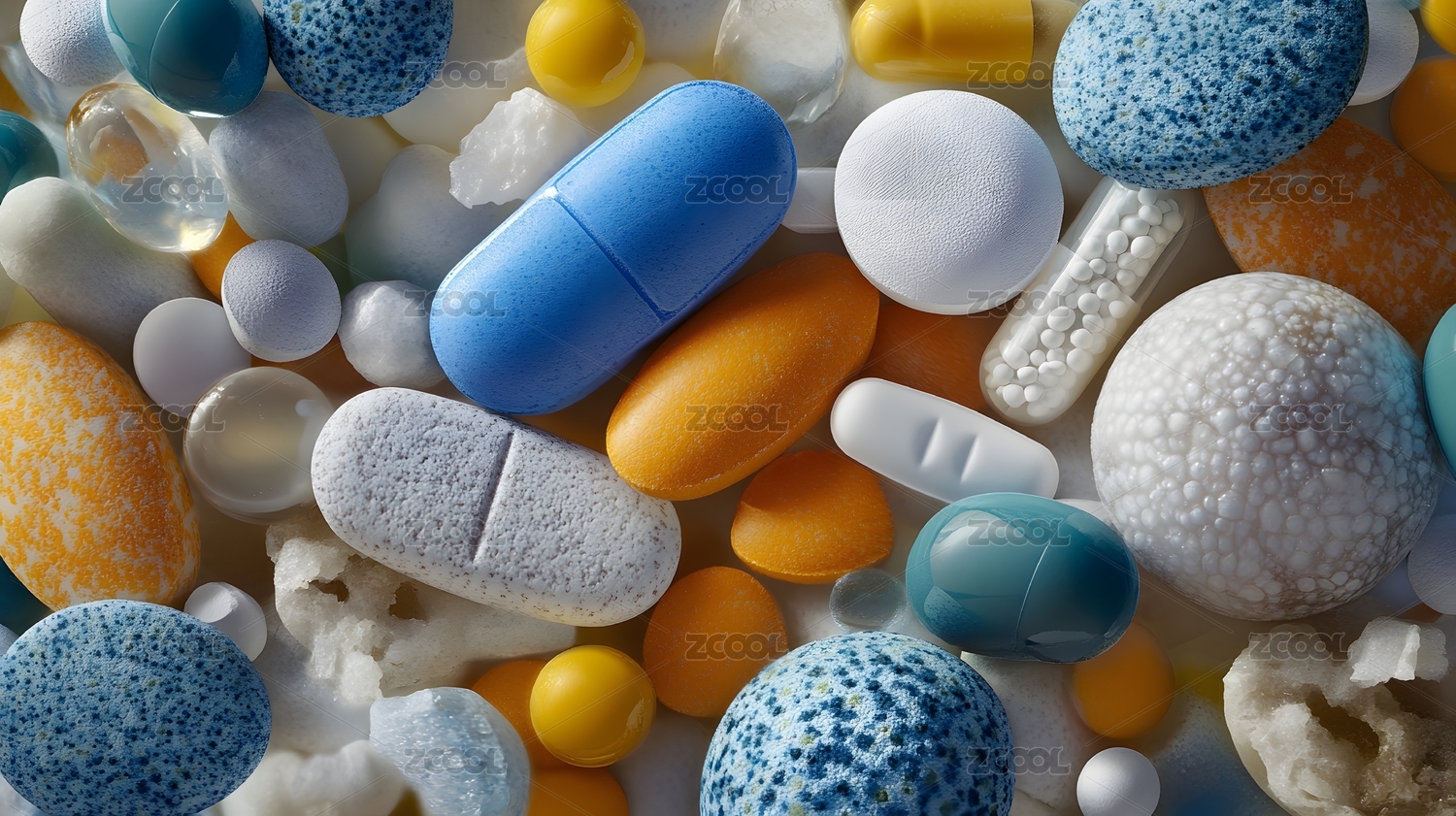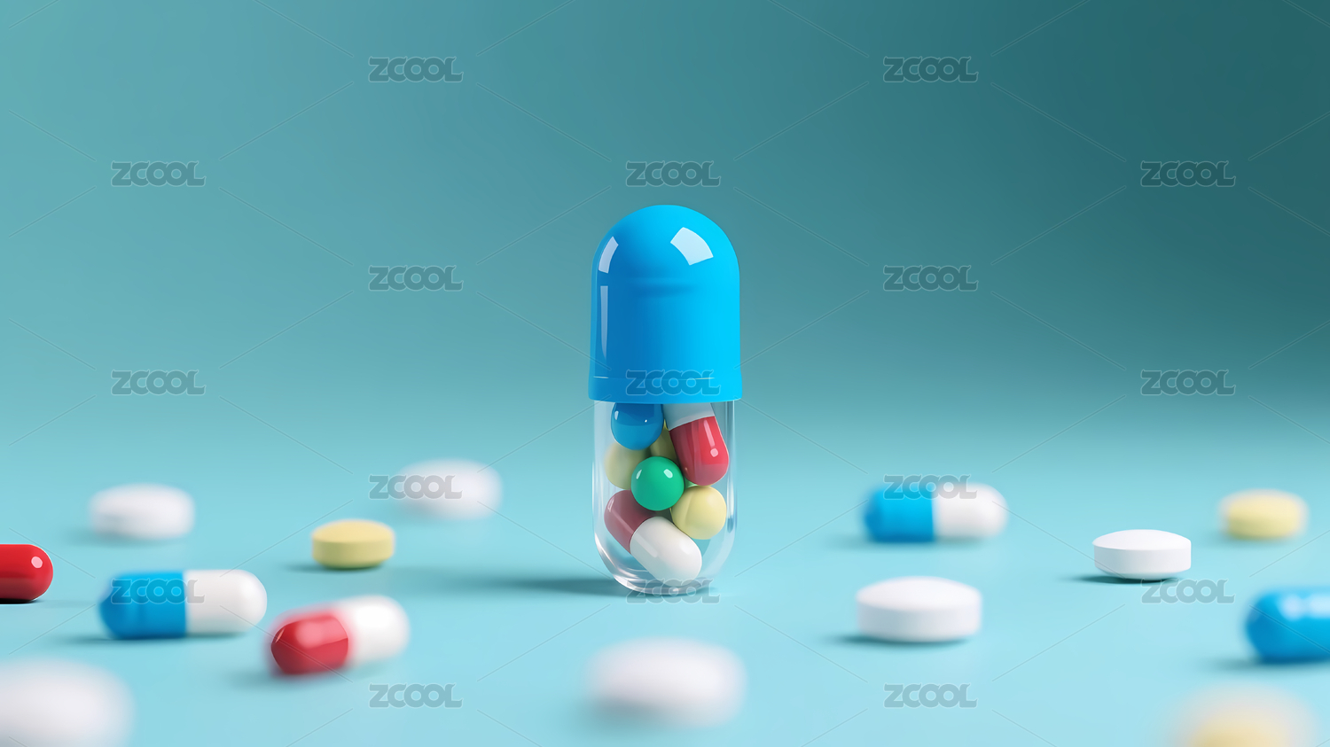 在蓝色背景上用于医疗治疗用中西药药丸胶囊