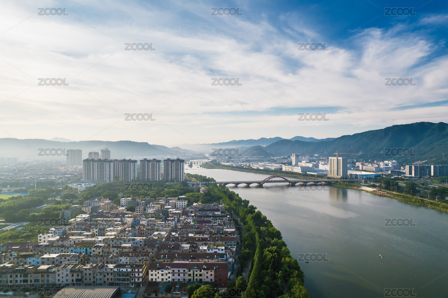 无人,城市,白昼,河流,桥,水,山,天台山,高视角,航拍视角