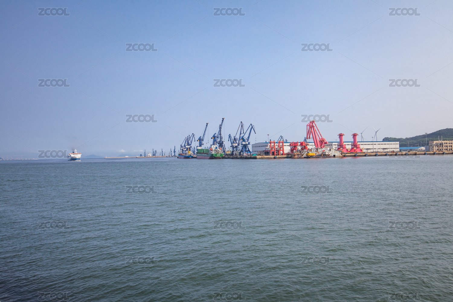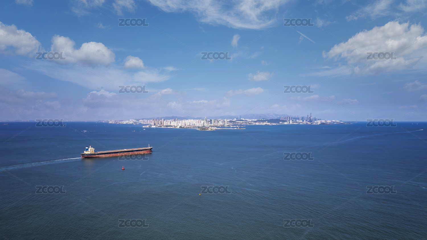 海滨城市风光正在进港的货轮
