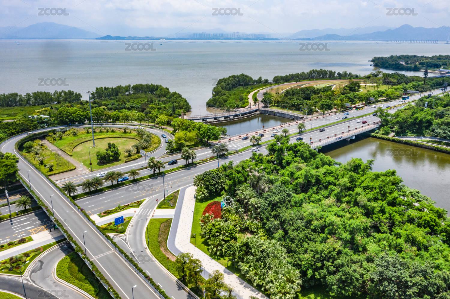 晴朗的早晨,航拍广东深圳湾大桥早晨风光