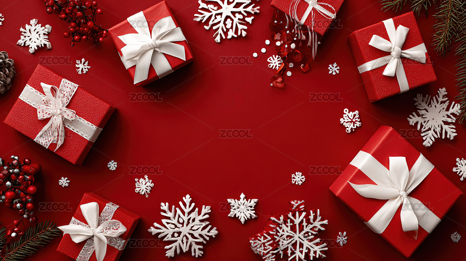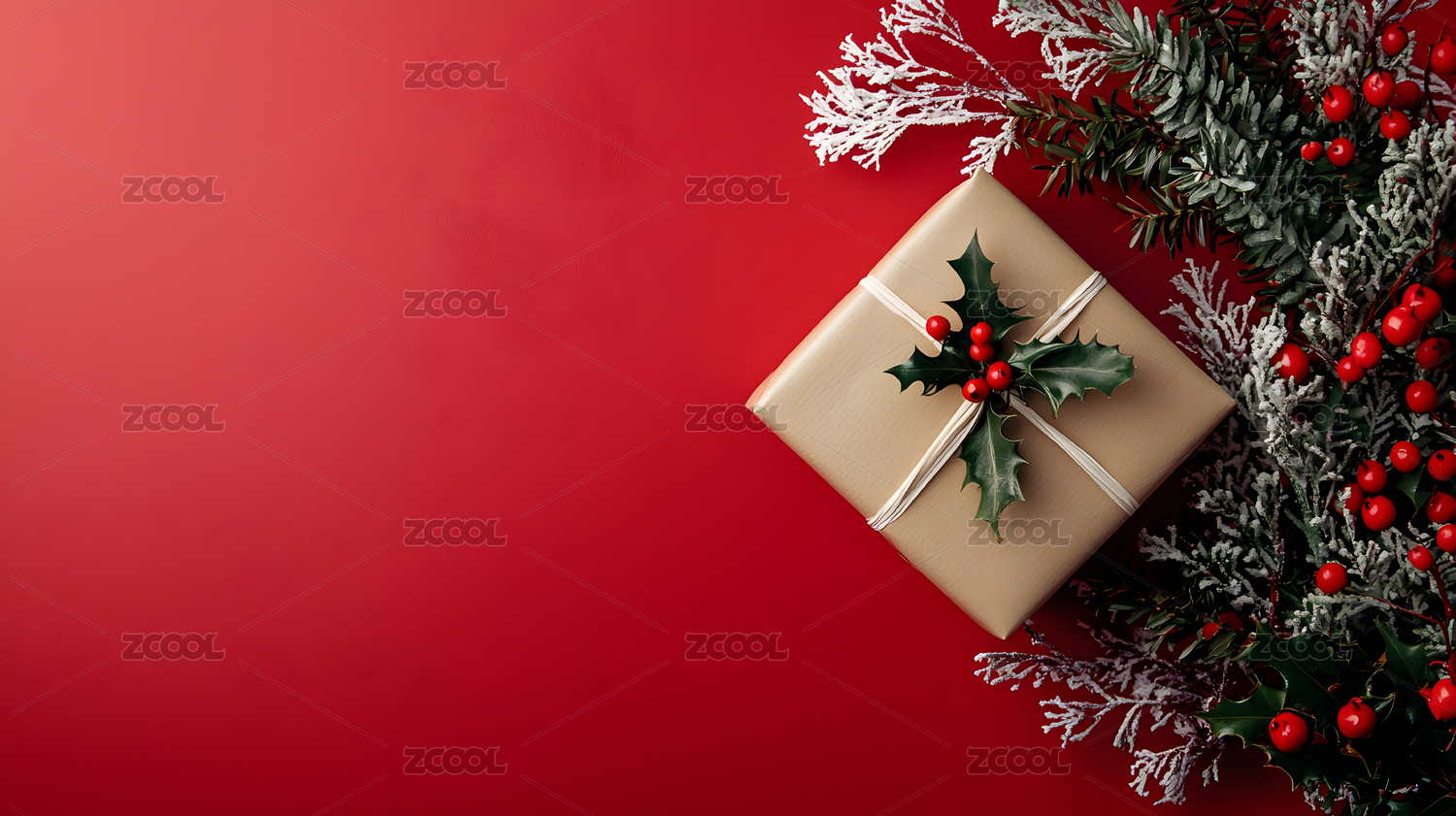 带有红色礼品盒松枝的圣诞节主题的红色背景