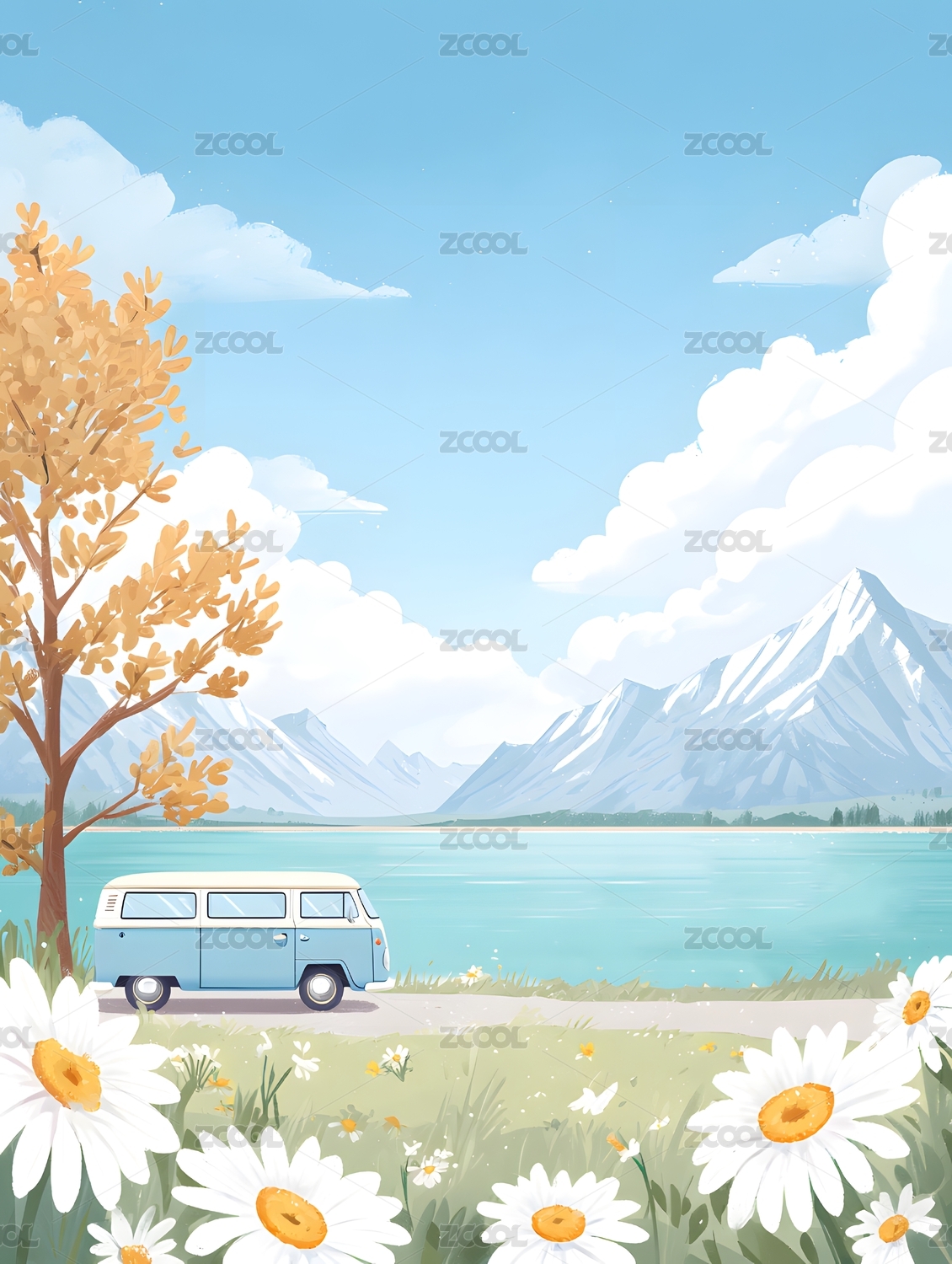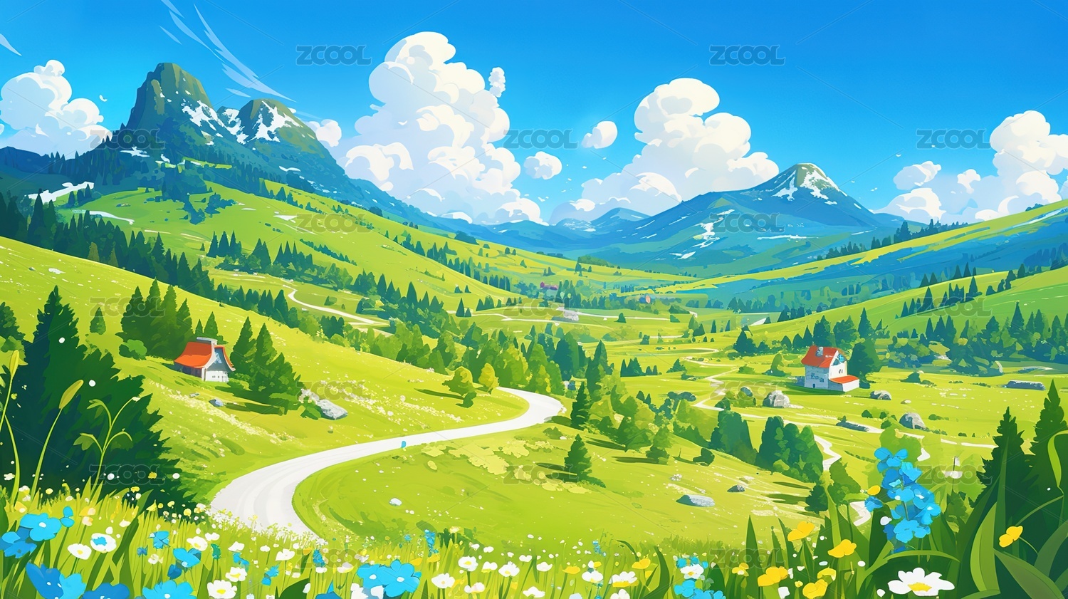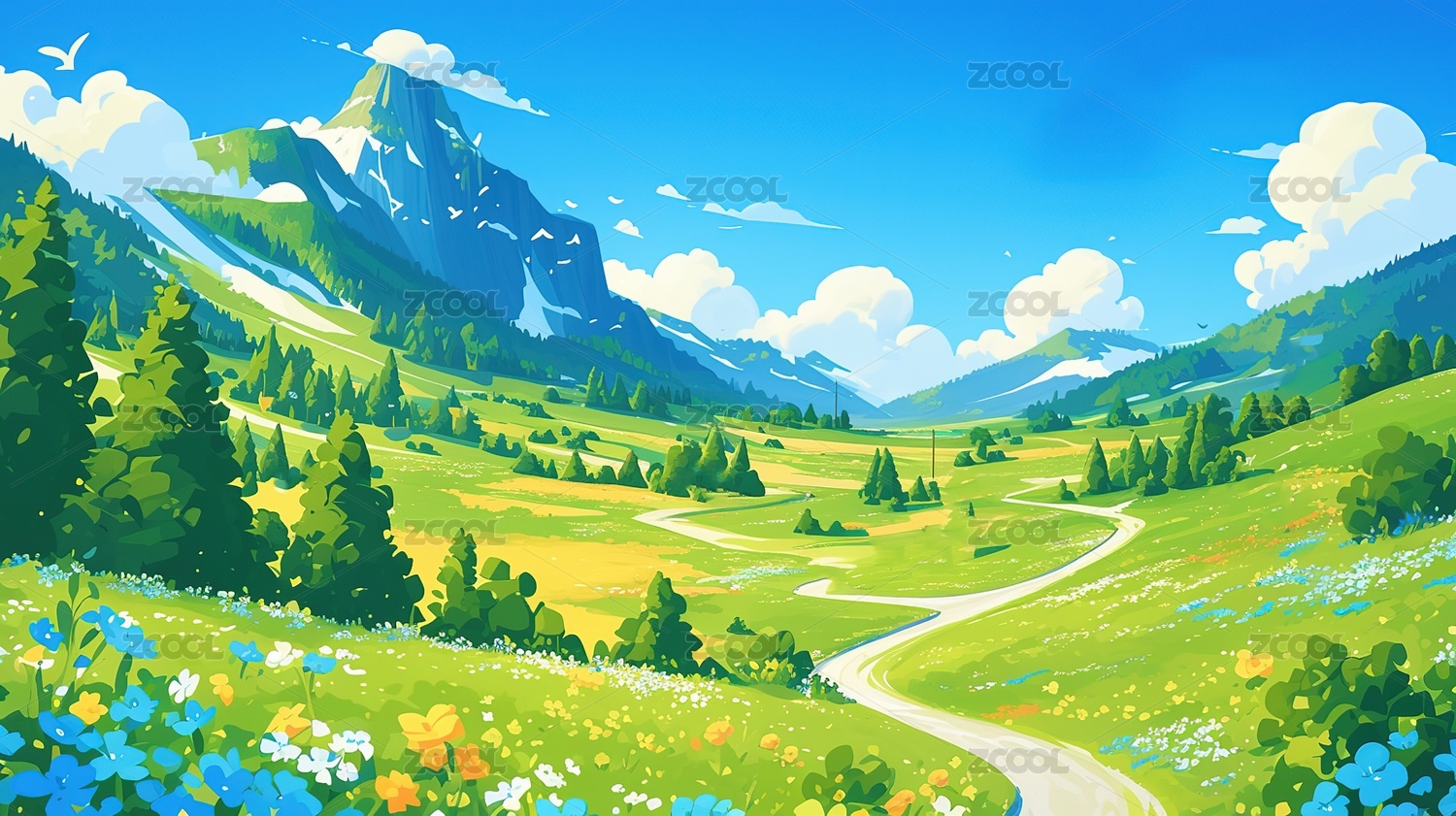 插画,旅行,旅游,AIGC202404,白云,雪山,山谷,草原,飞鸟,出行