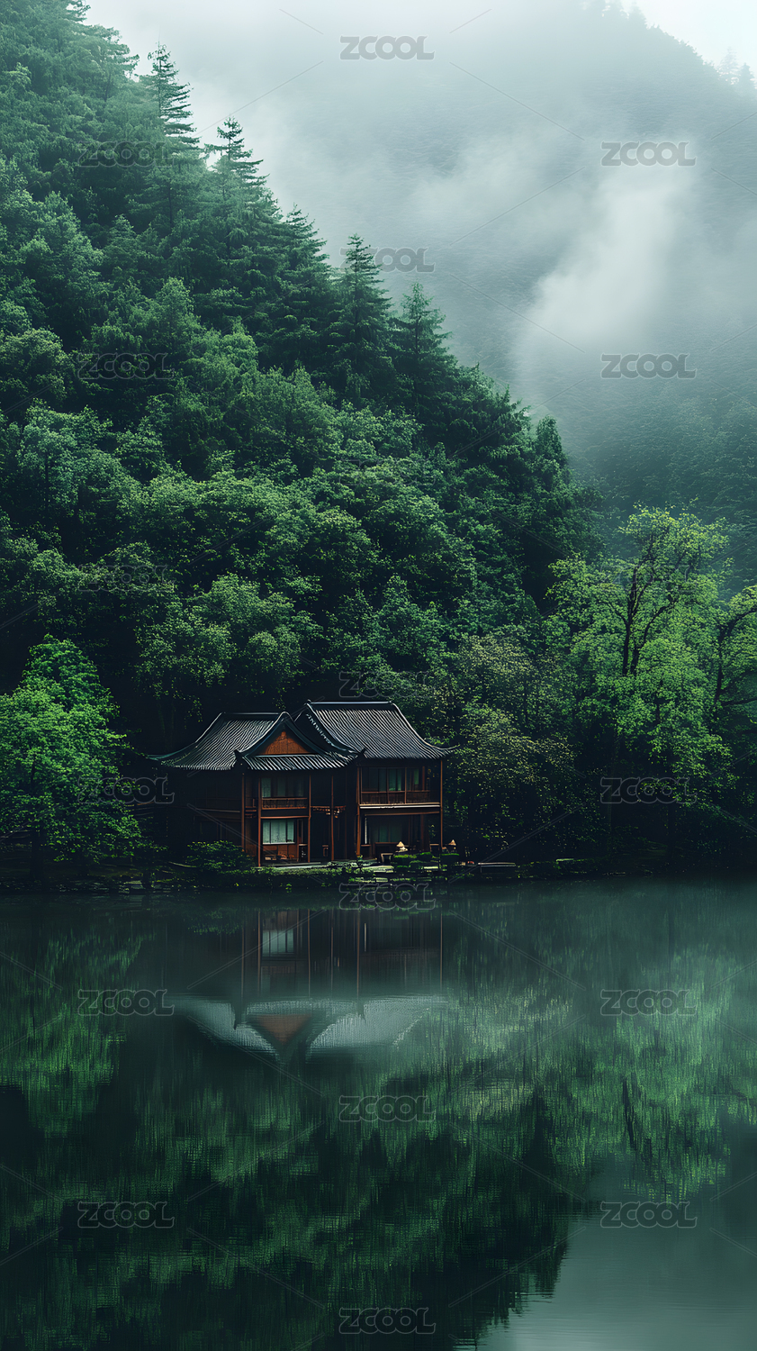 晨雾轻绕湖面阳光穿透树林倒影如画