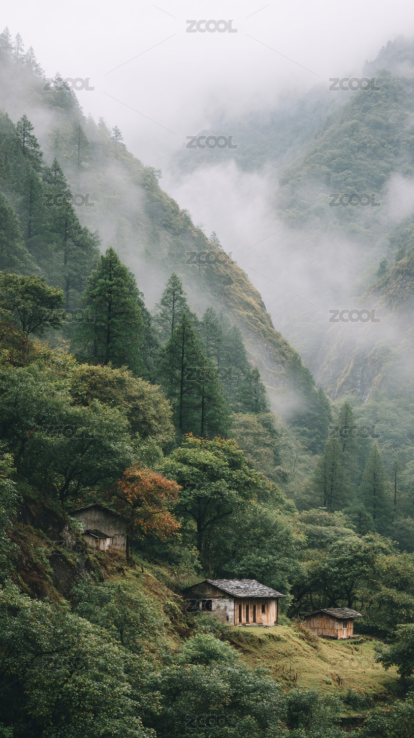 秋天,雾气,宁静氛围,自然风光,古村,传统房屋,黑瓦木结构,枫叶,黄色树叶,橙色花朵