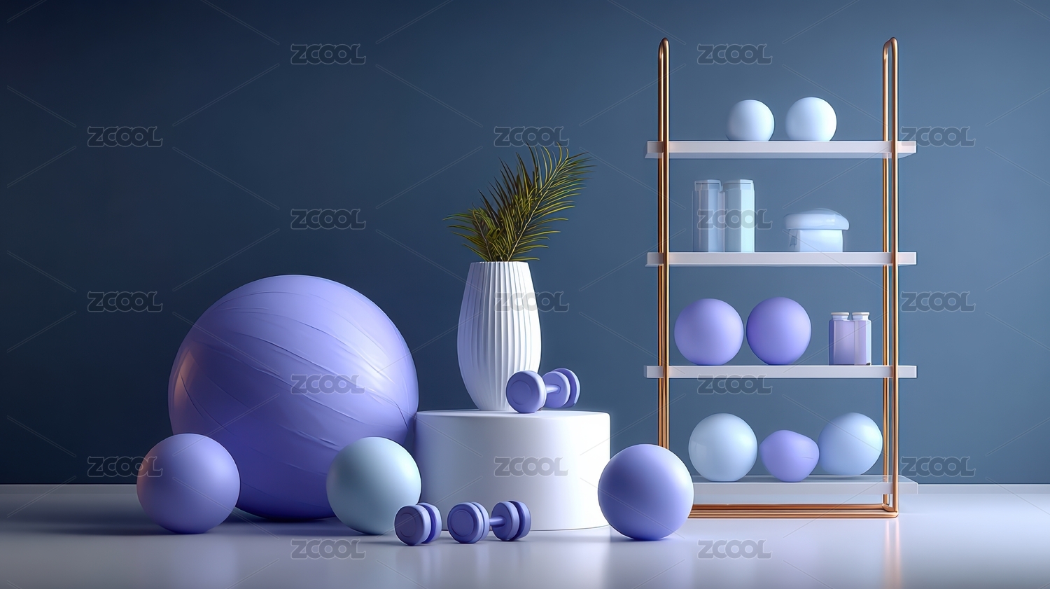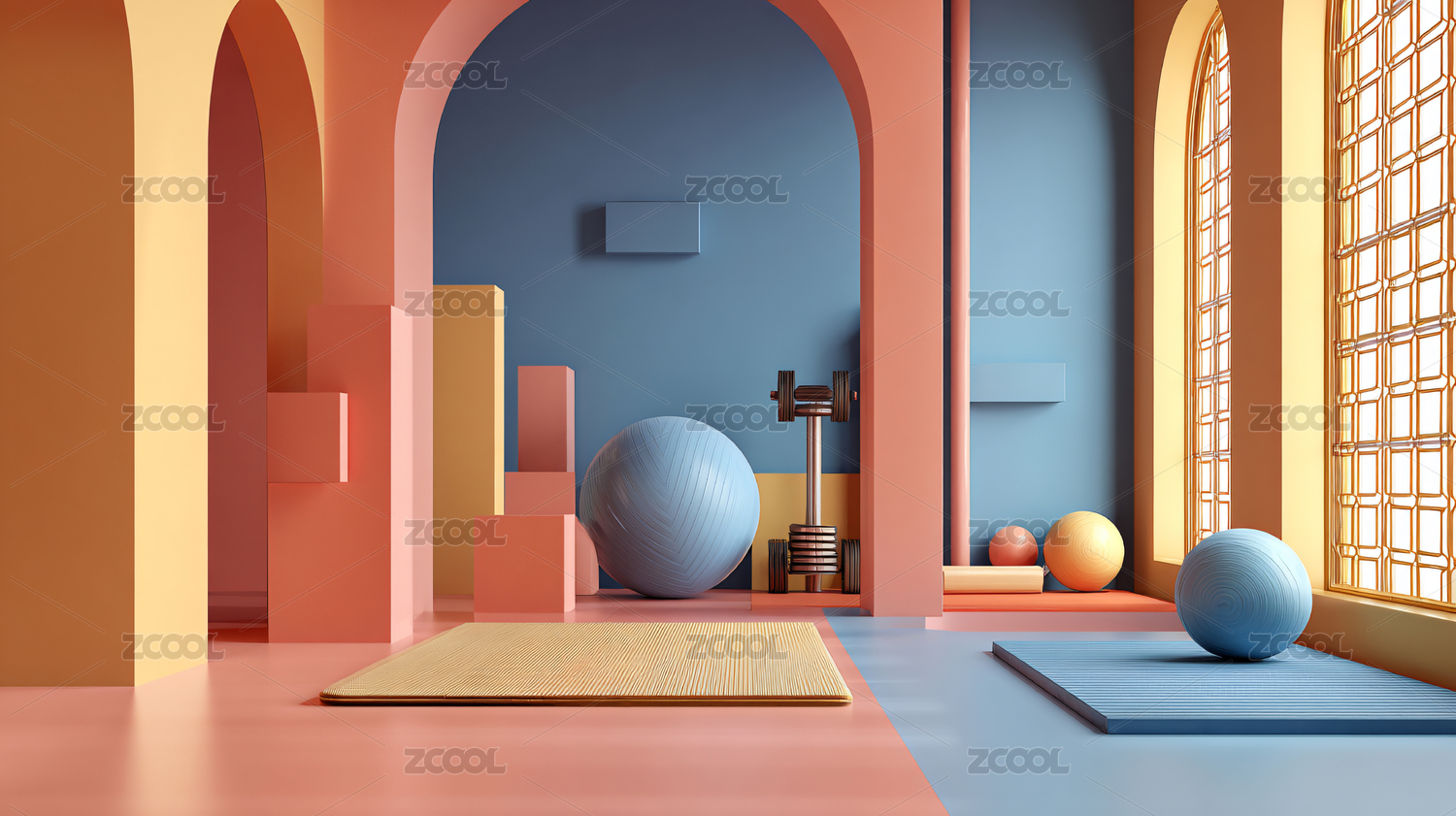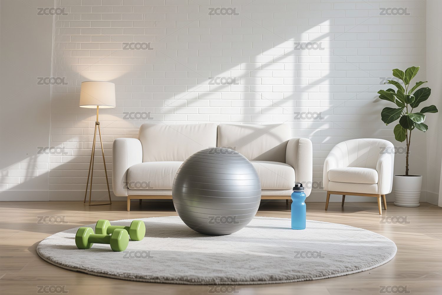 客厅内沙发地毯盆栽健身球等运动场景设计