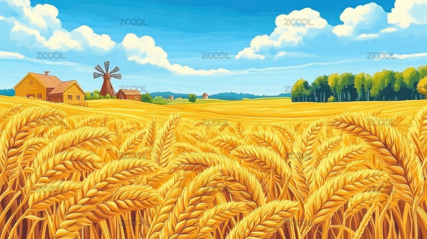 秋天,麦田,丰收,风景,插画,AIGC202402,设计