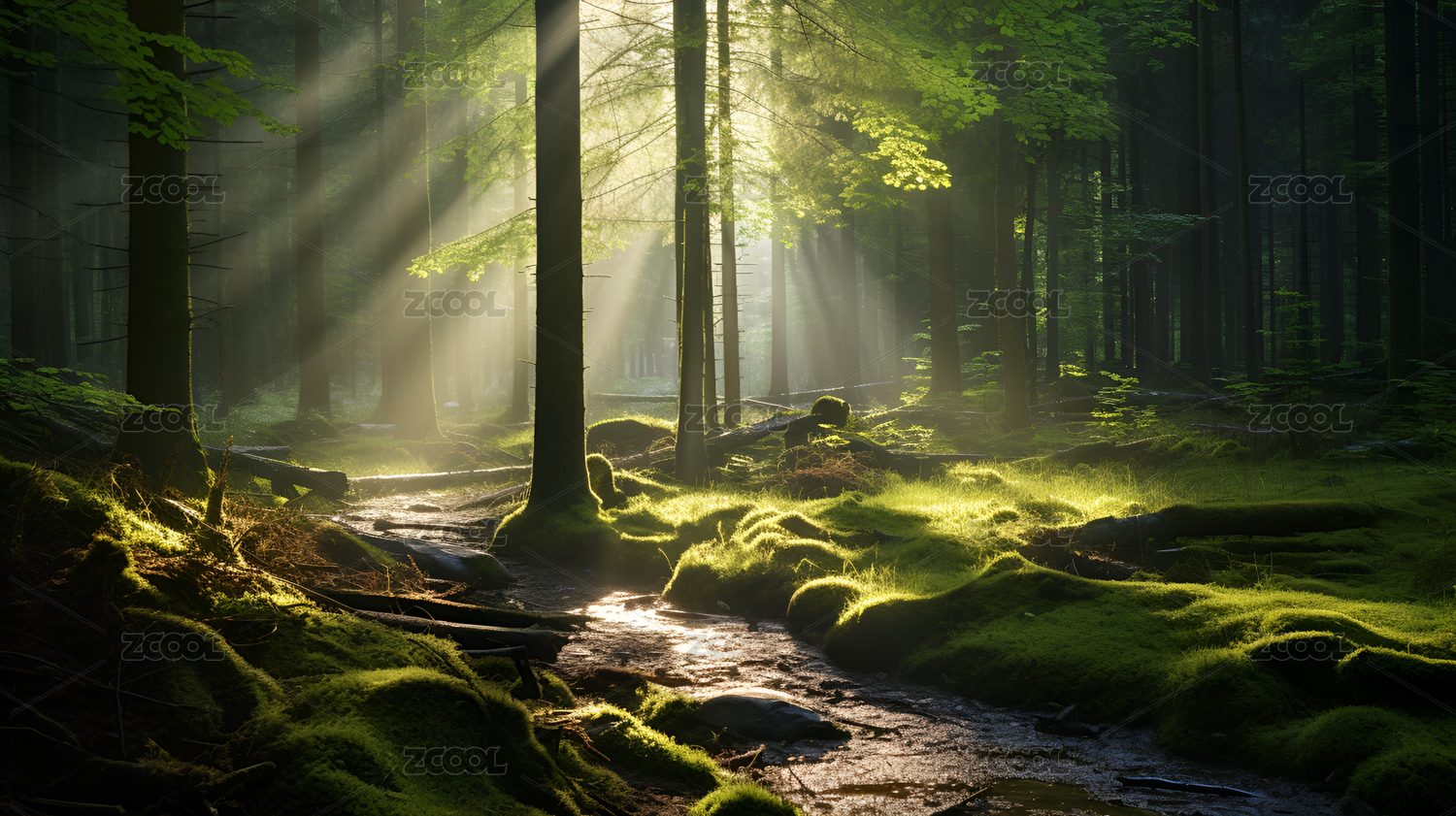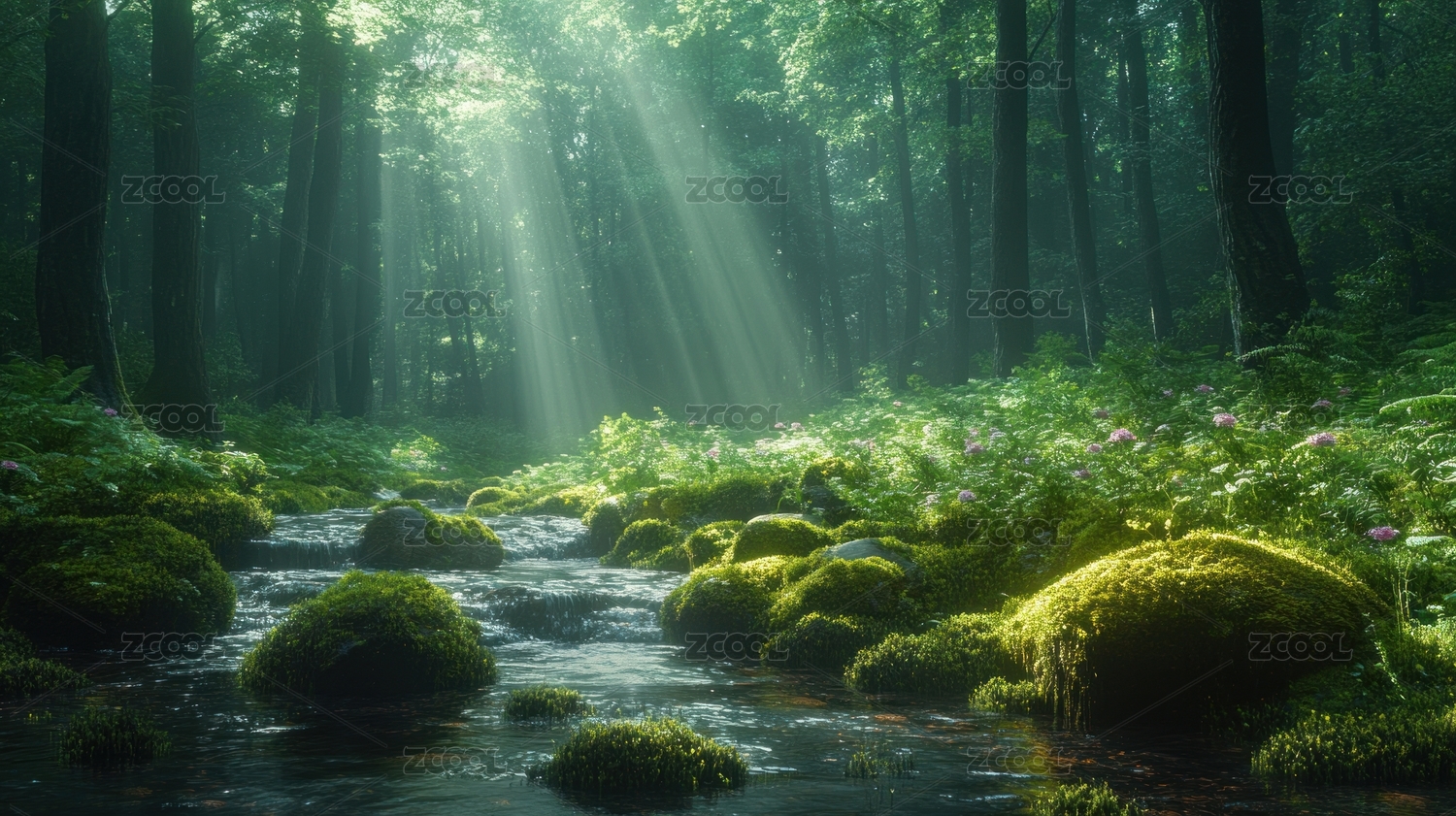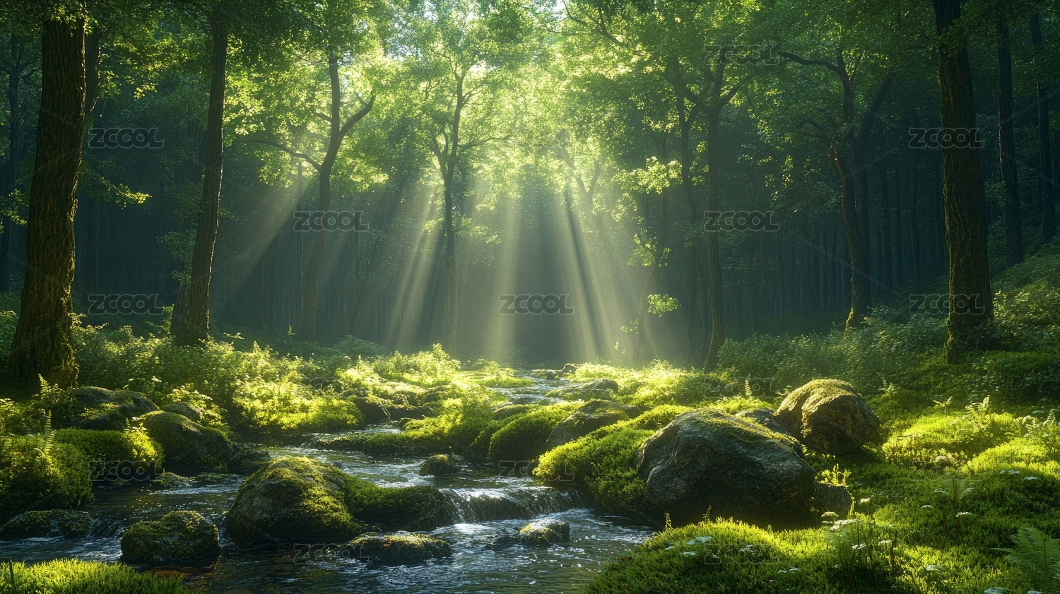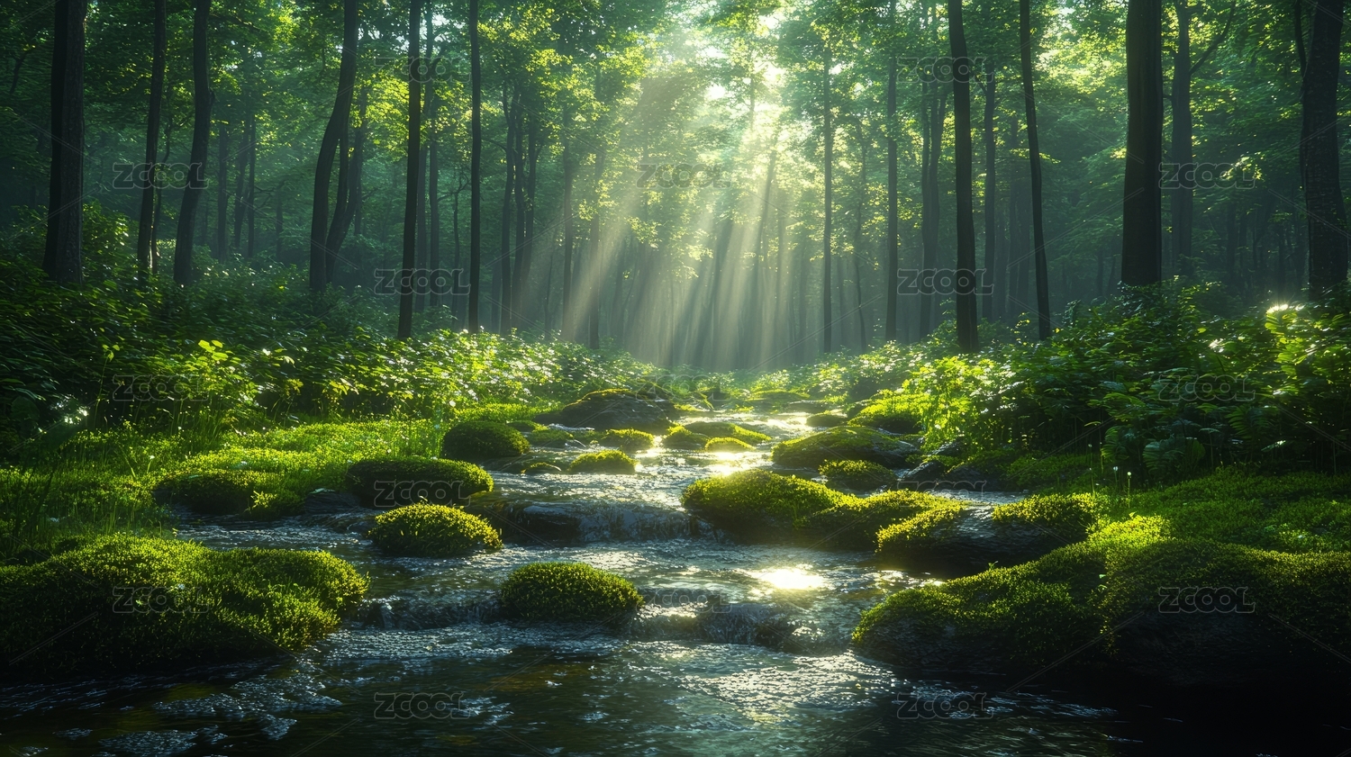 绿色森林溪流与阳光