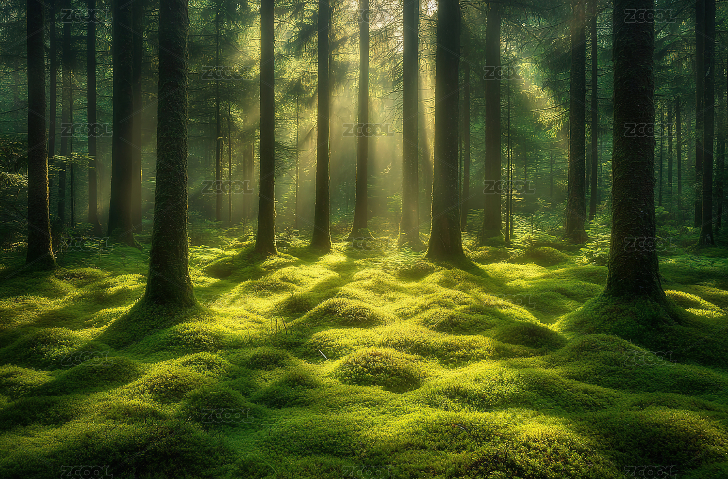 阳光下的苔藓森林