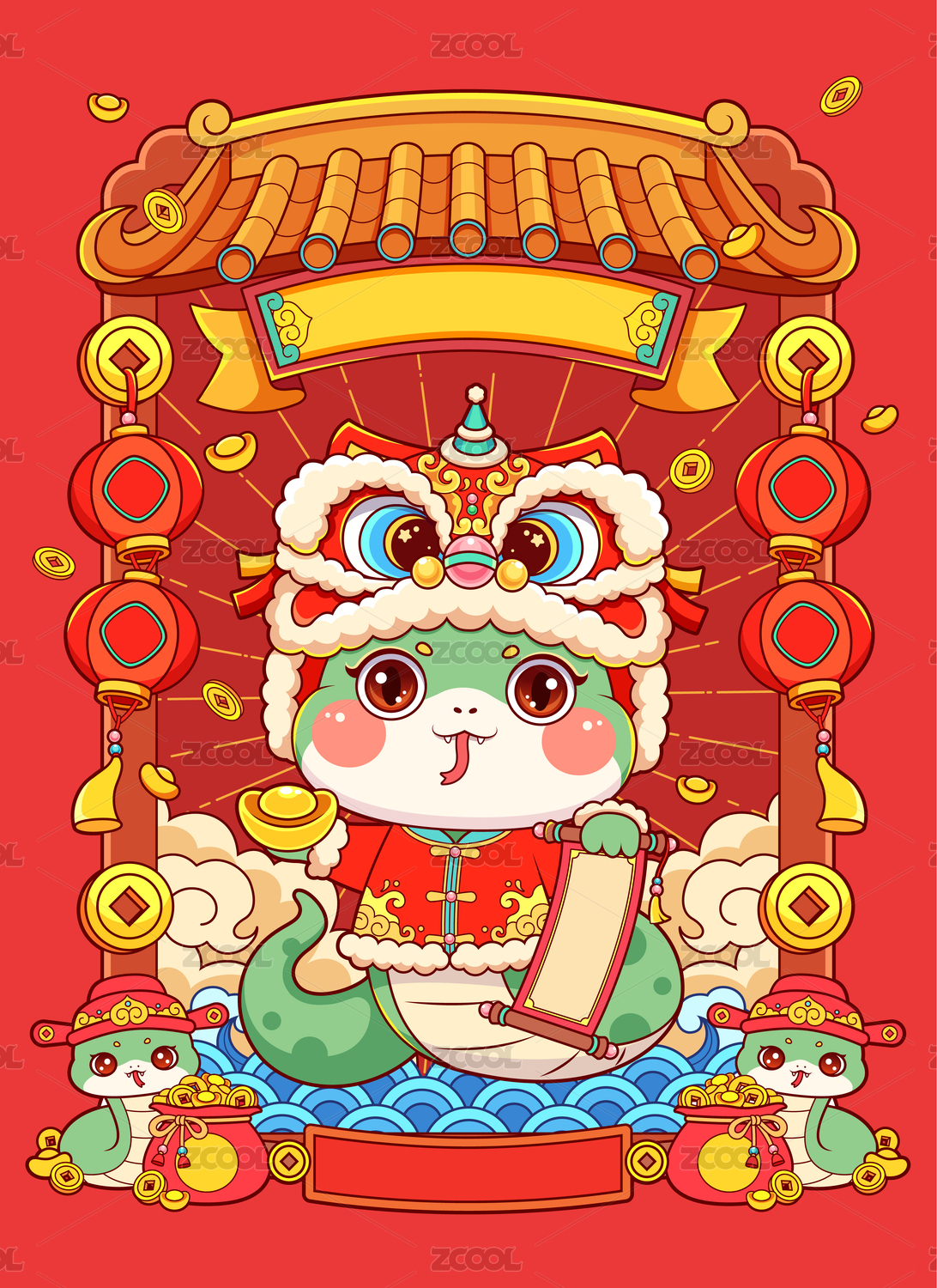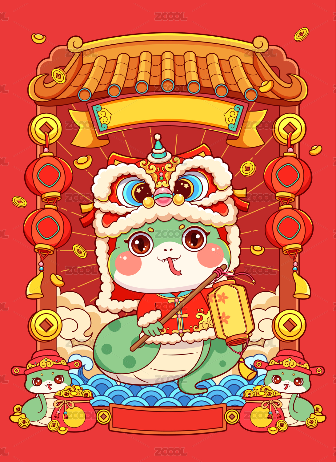 蛇年头戴醒狮帽卡通蛇矢量插画