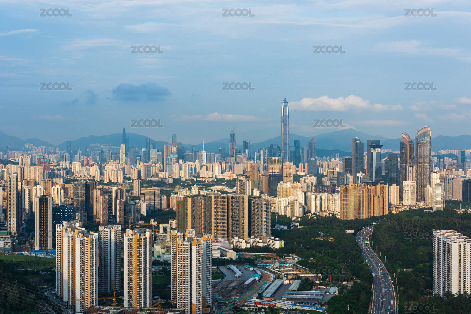 鸟瞰中国广东省深圳城市天际线建筑群高楼大厦黄昏风光