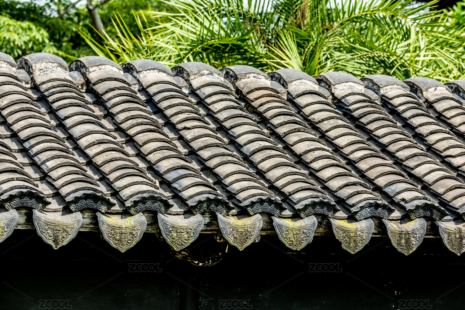 中式园林建筑屋檐瓦当特写
