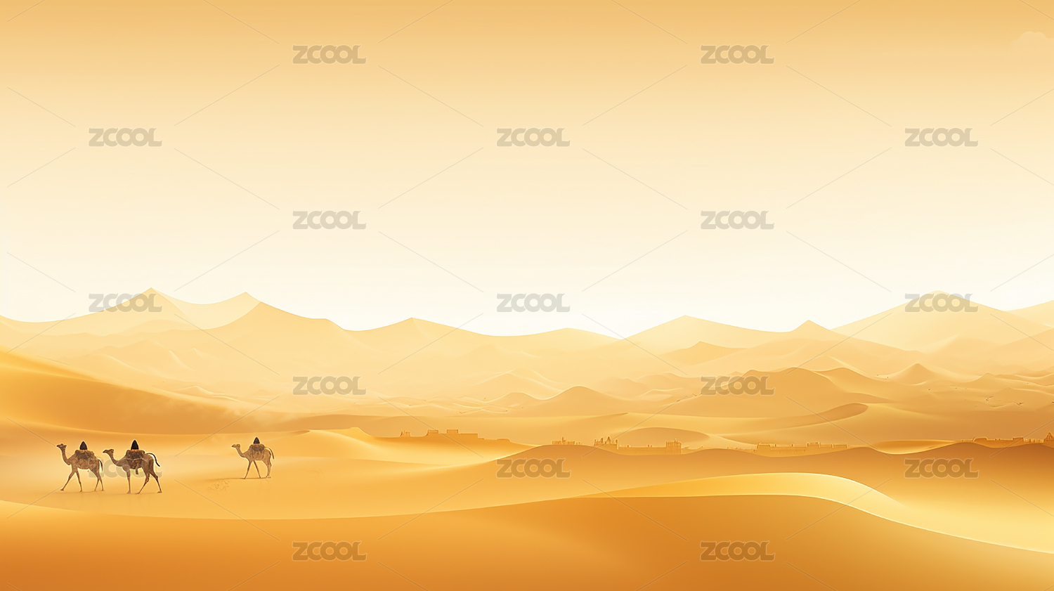 丝绸之路沙漠骑骆驼队伍夕阳剪影