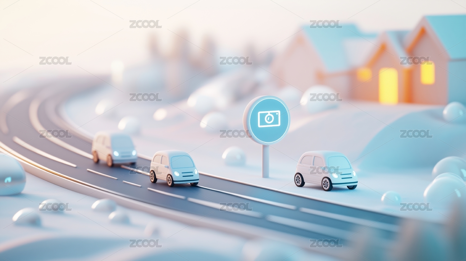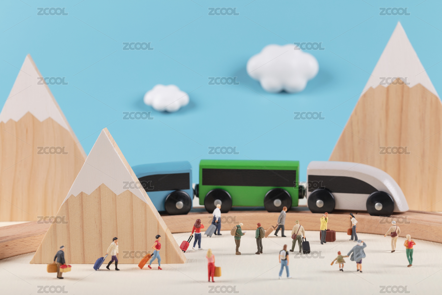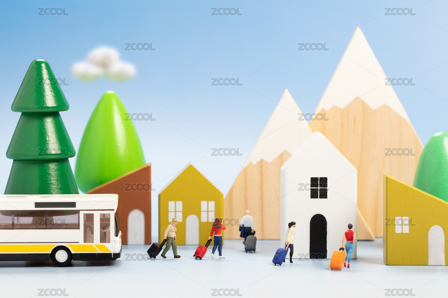 微缩创意雪山脚下拿着行李去酒店民宿的游客