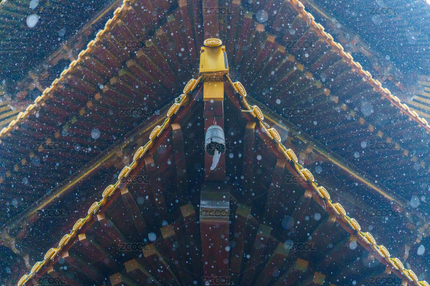 冬天寒冷大雪建筑历史屋檐彩绘旅游背景老君