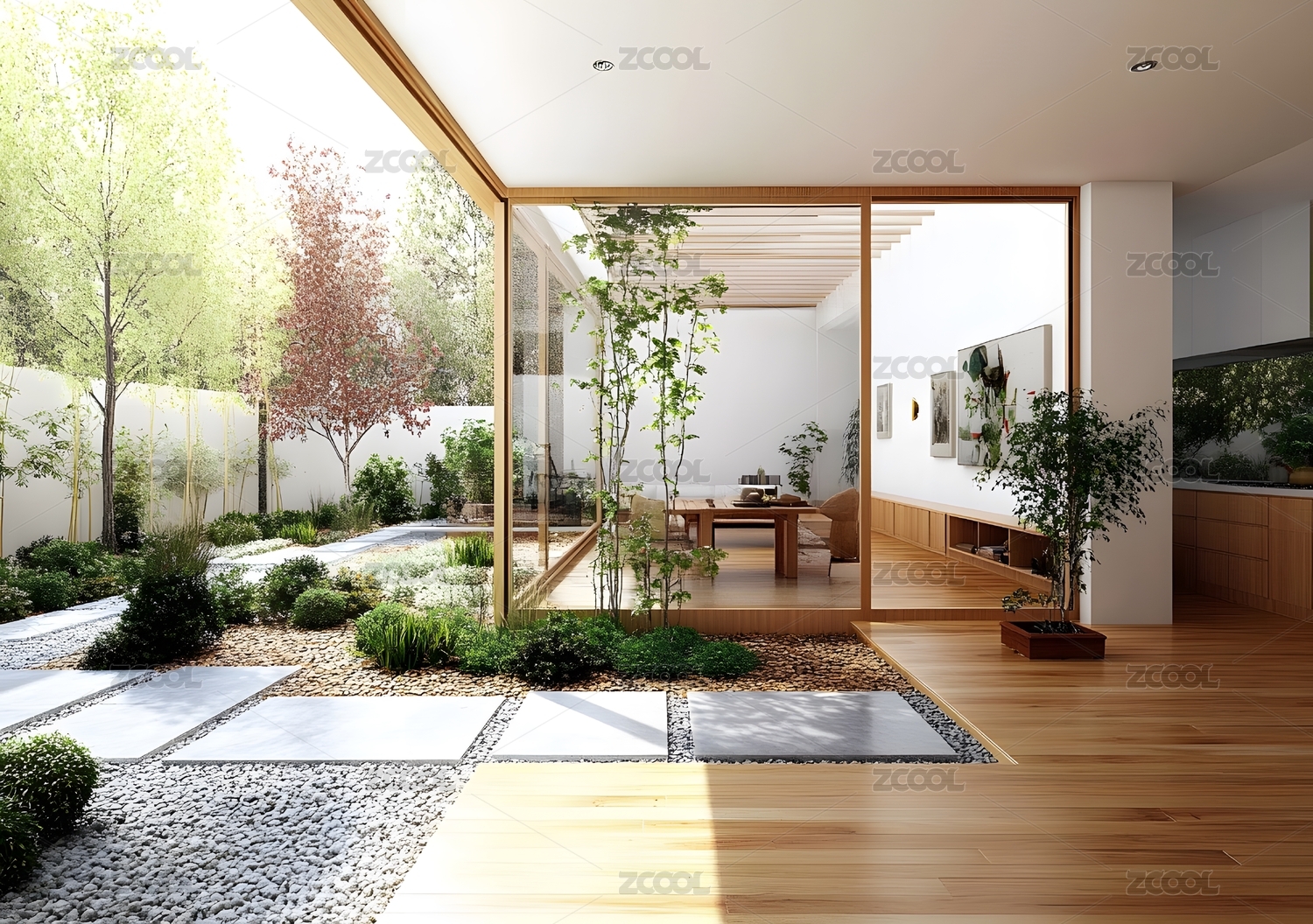 现代,庭院,设计,展示,房屋,建筑,玻璃门,露台,室外,花园