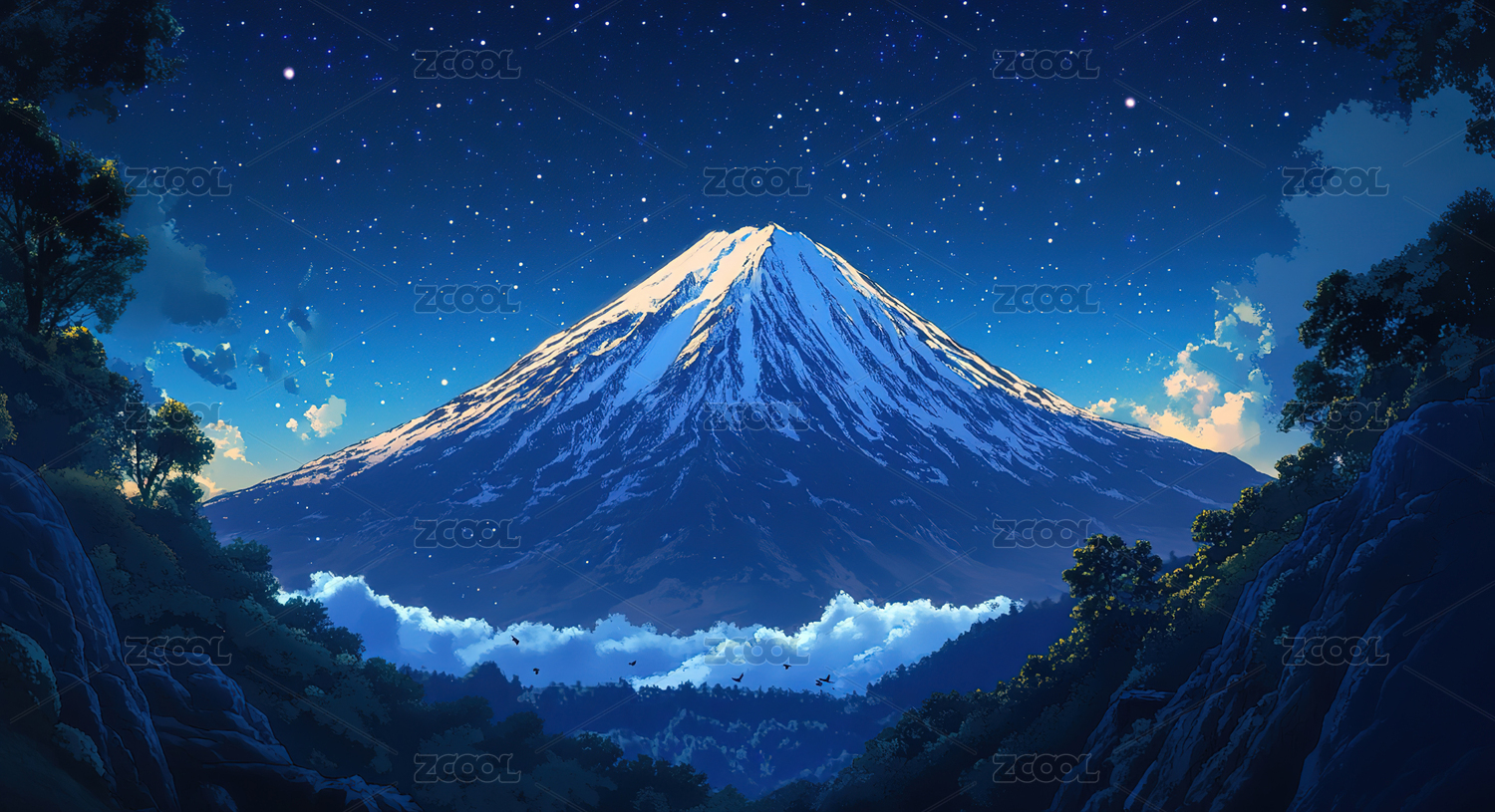 星空,雪山,小镇,夜晚,灯光,山峰,云层,树木,道路,房屋