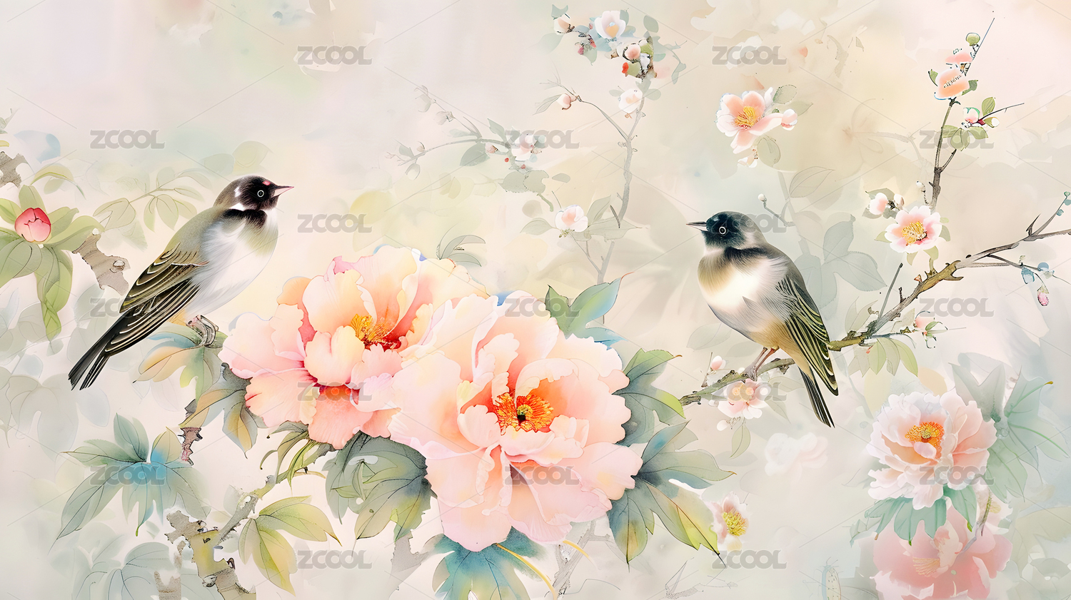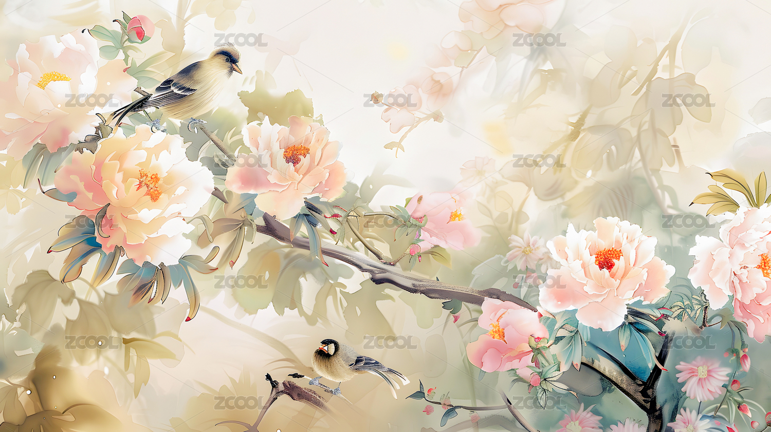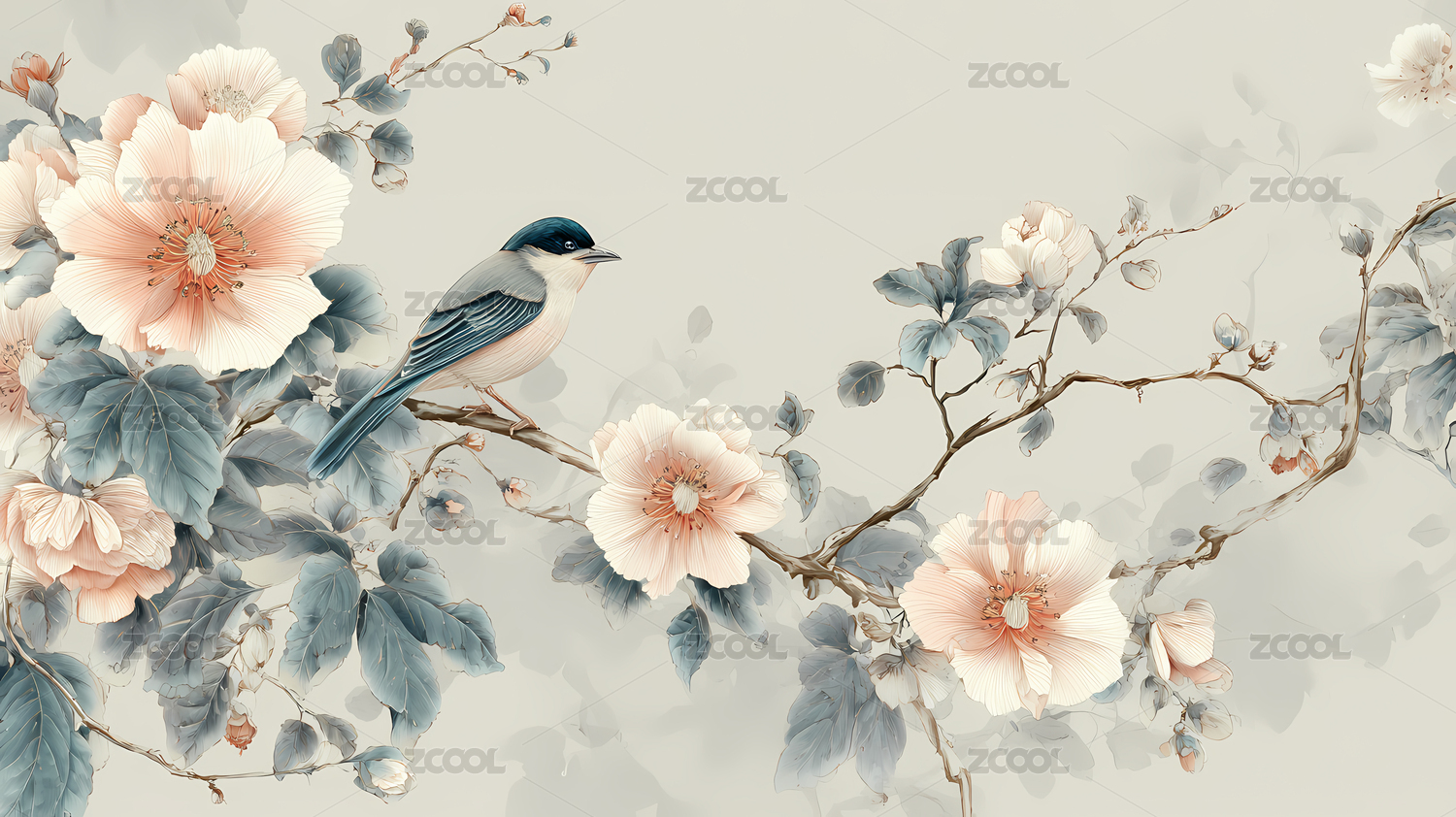 中国风淡彩水墨花鸟植物插画壁纸背景