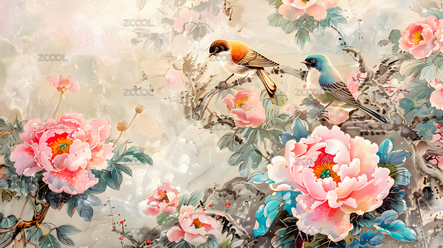 花卉,鸟,古风,水墨,水彩,花鸟画,富贵,复古