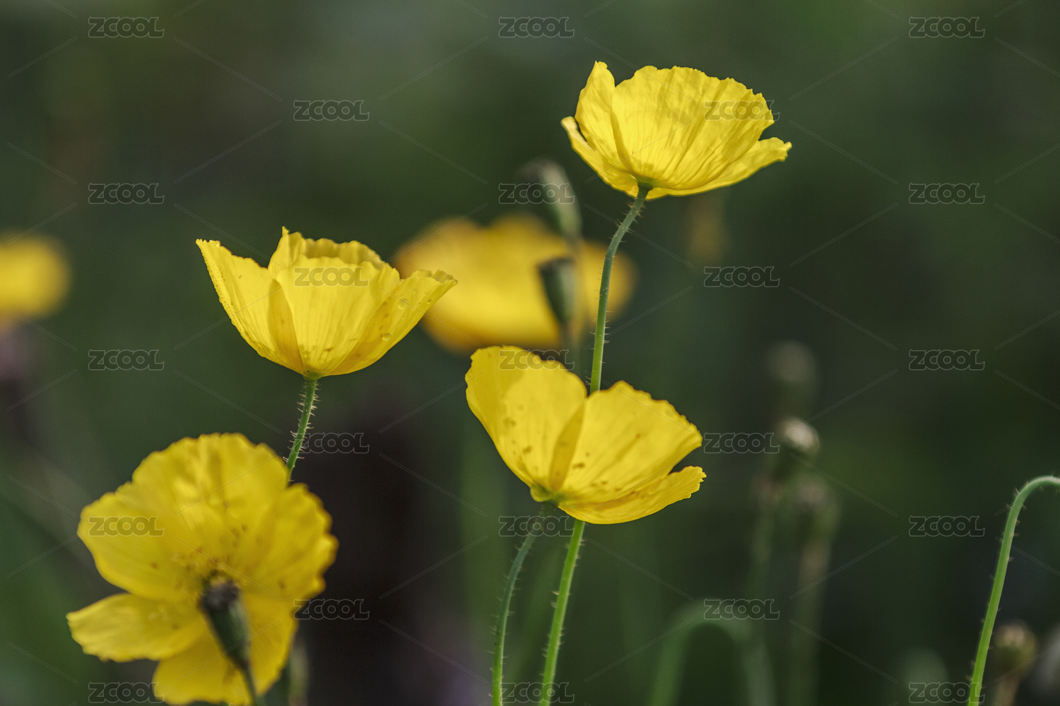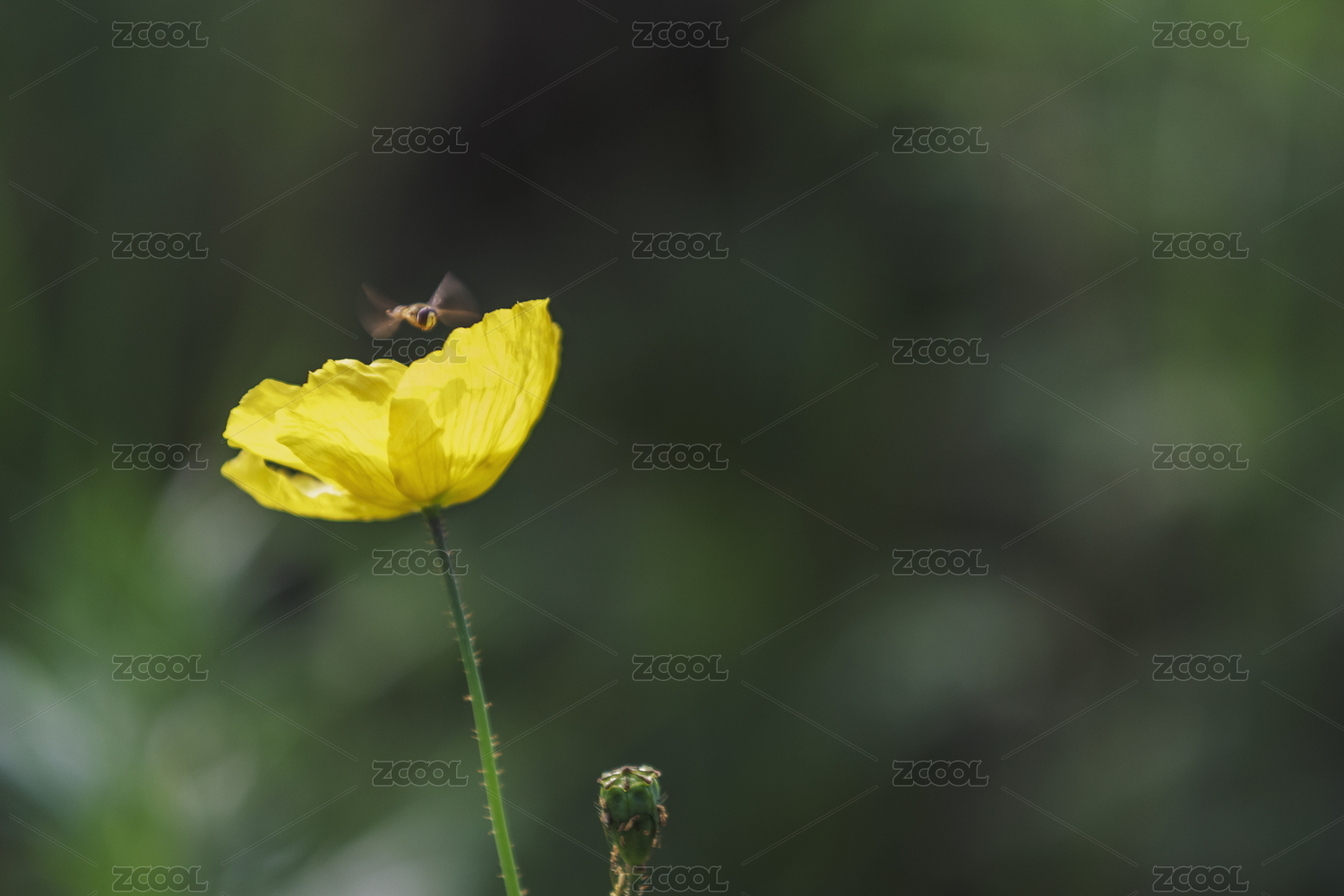 暗背景中的花卉黄色野罂粟及飞行中的小蜜蜂特写