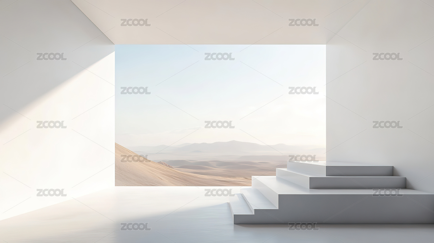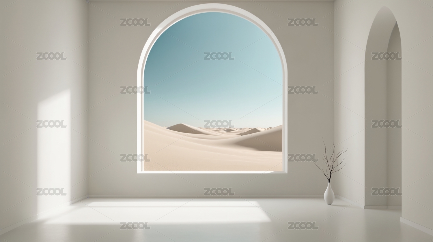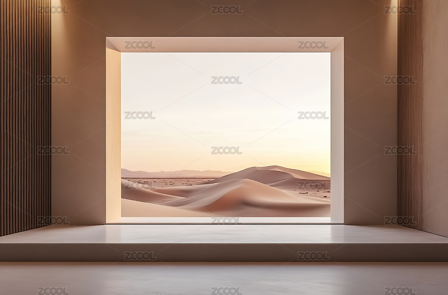 简约室内空间与窗外沙漠景观