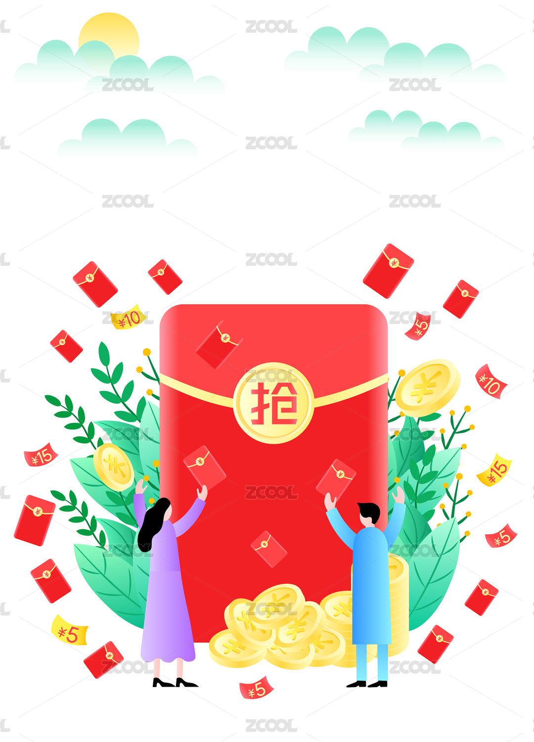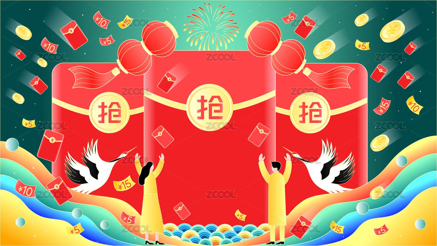 炫彩国潮抢红包优惠券红包雨金币矢量插画