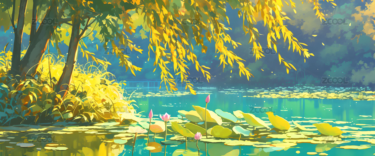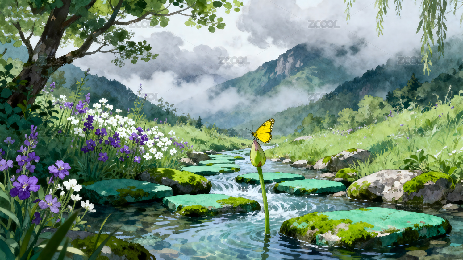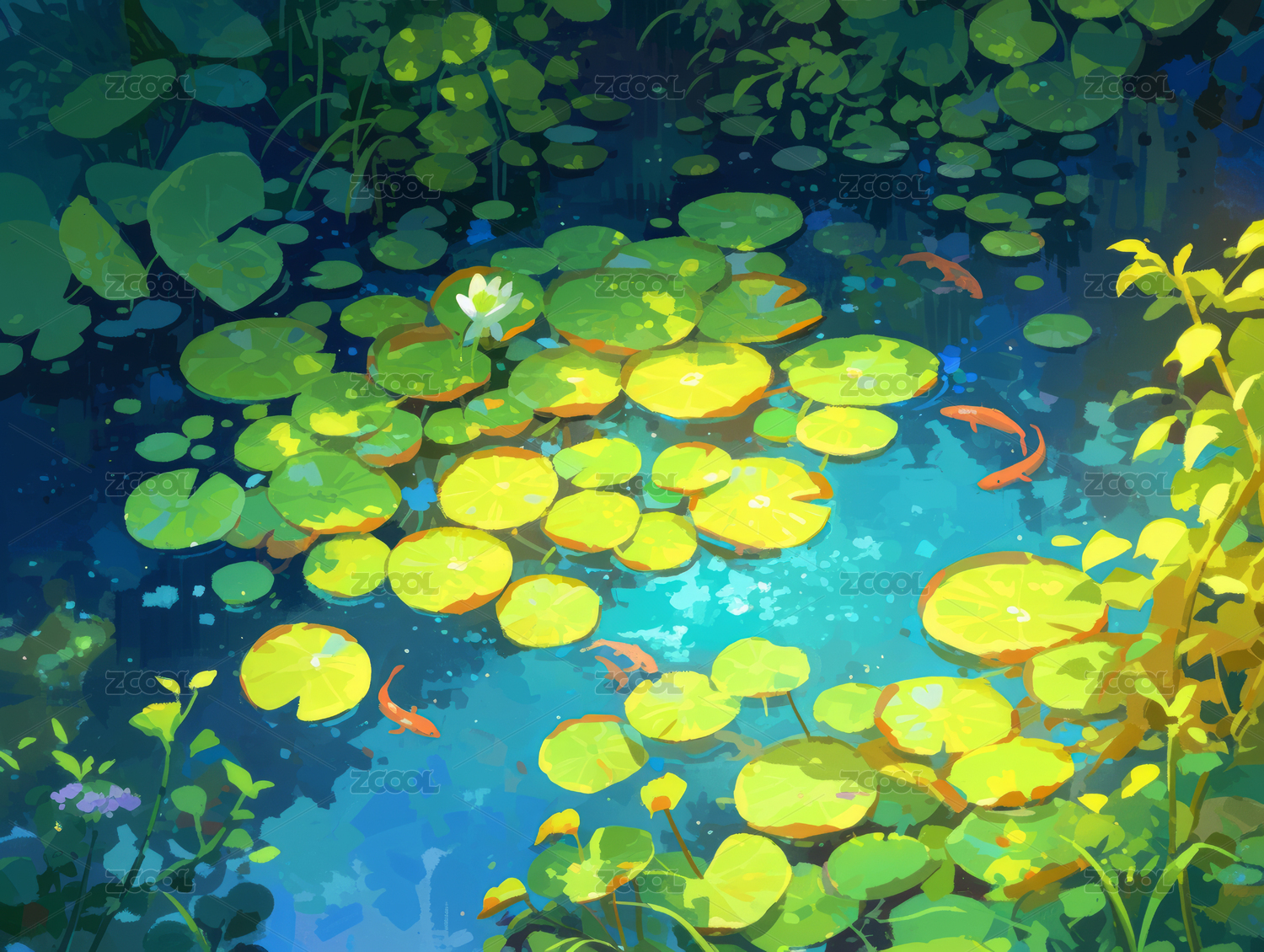 森林旁的小溪里坐在荷叶上的青蛙王子和蝌蚪打招呼