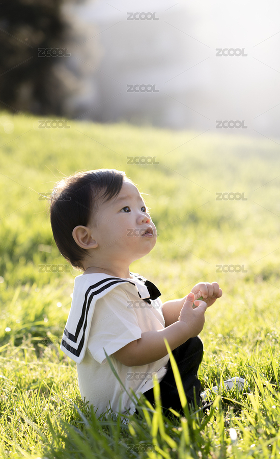 夏天坐在公园草地中看向远处的一岁中国儿童