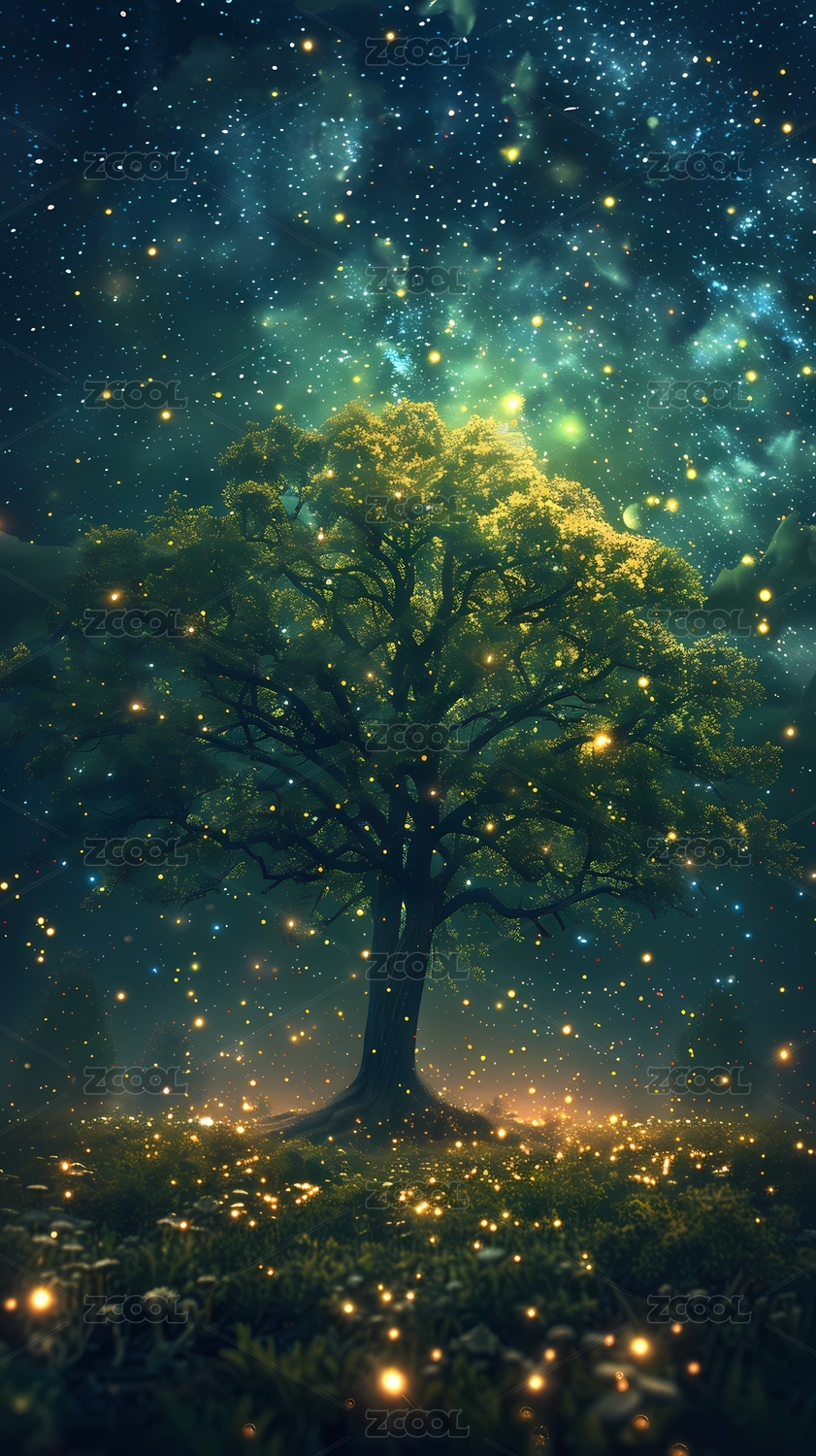星星,灯光,树木,植物,绿色,草地,闪光,闪烁,火花,魔法