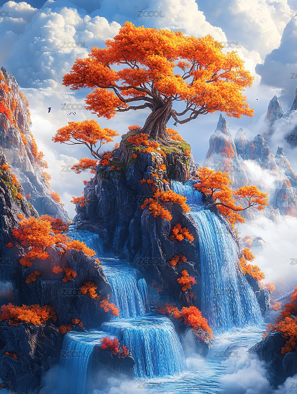 抽象,瀑布,天空,山脉,曲线,青色,橙色,波浪,线条,图形