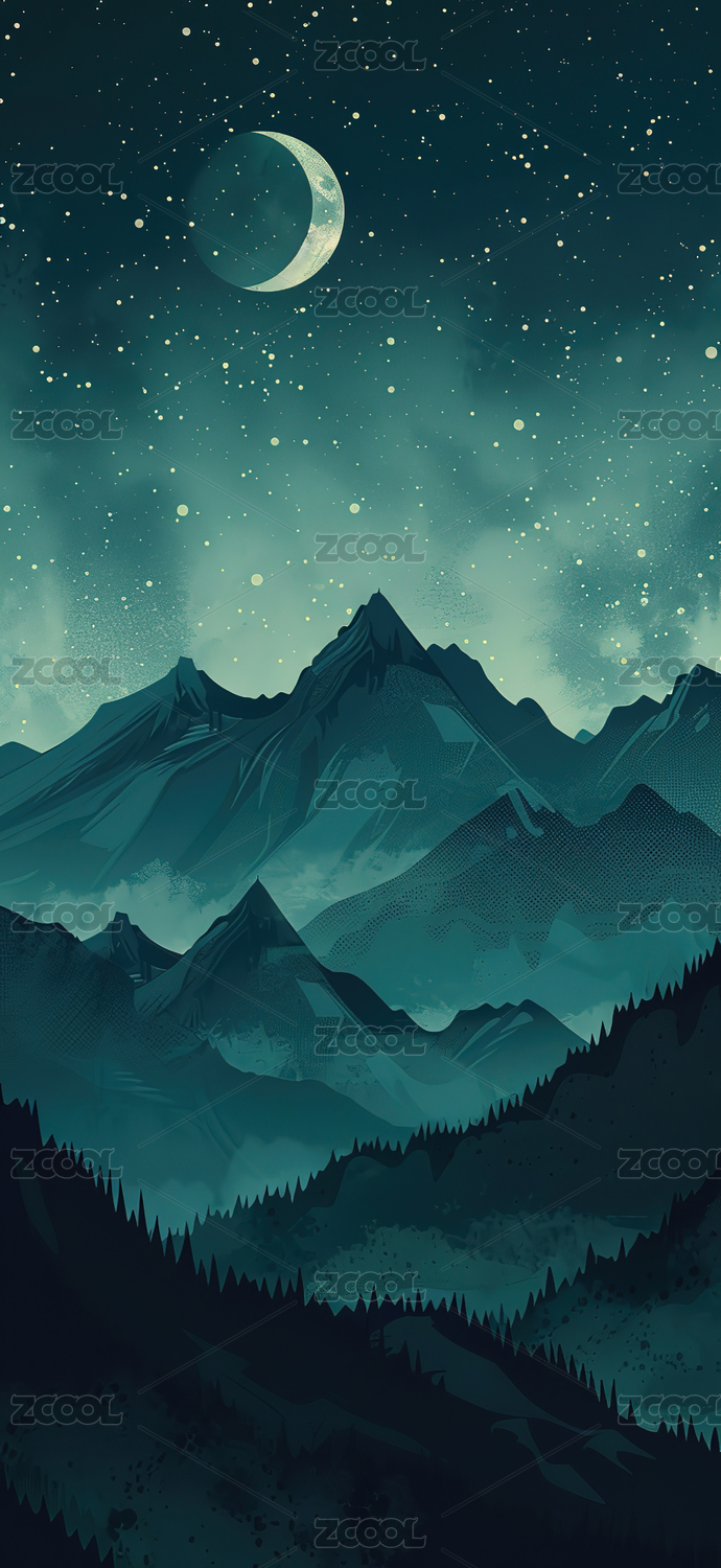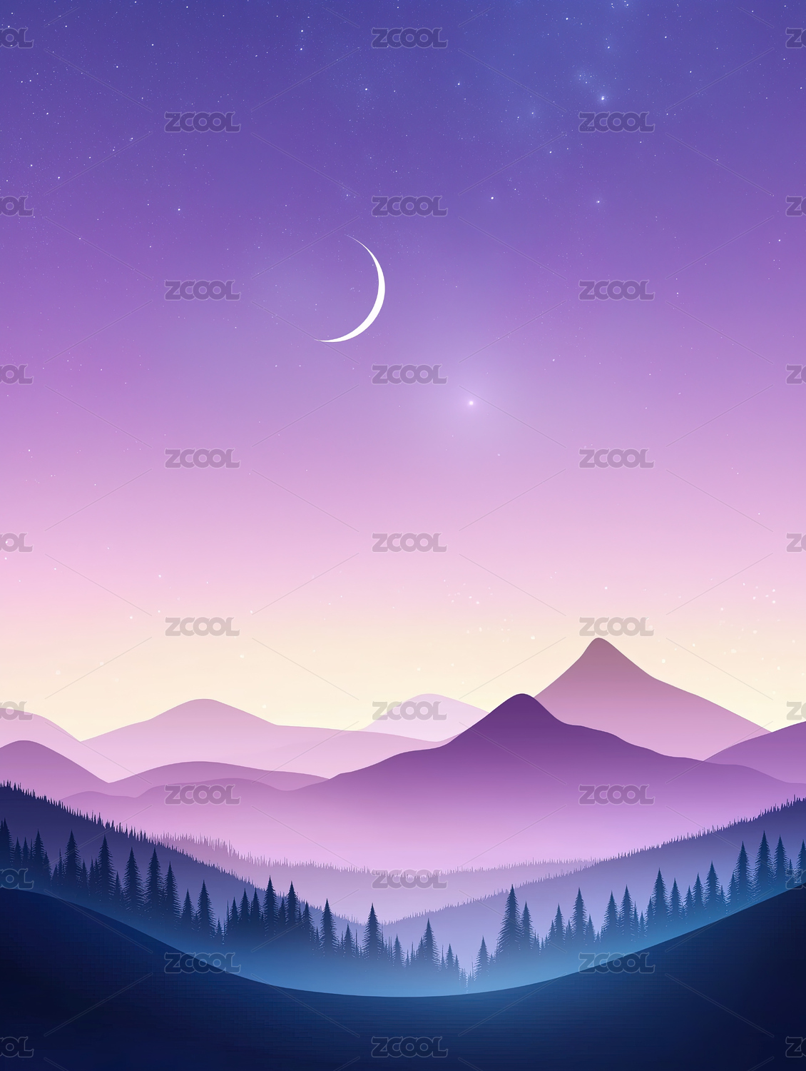 平静,夜晚,星星,月亮,天空,光线,户外,线条,插图,水彩