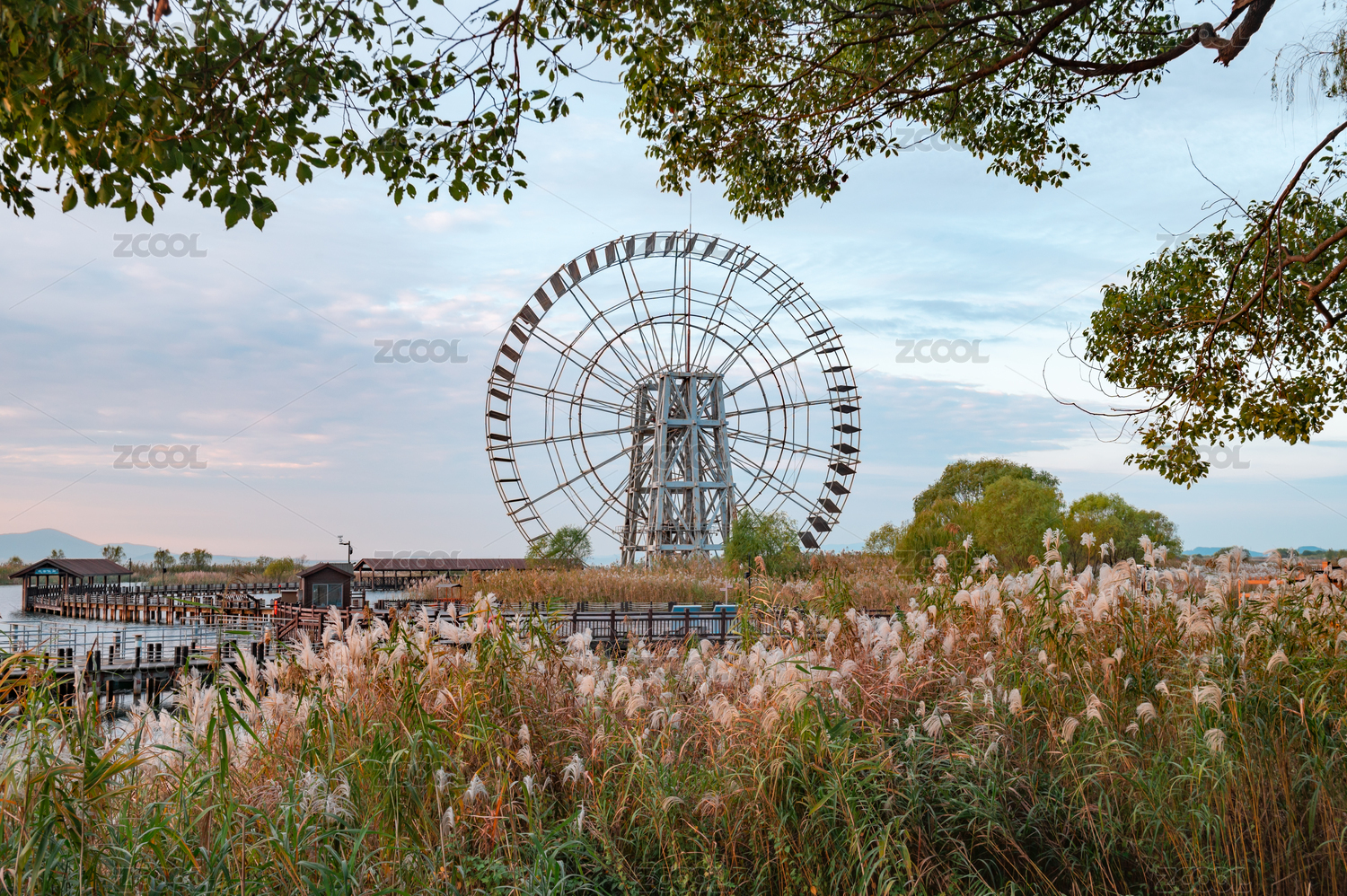 大风车,水车,水,天空,云,芦苇,紫色,梦幻,湖面,苏州