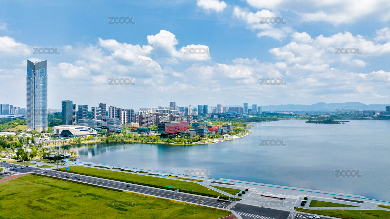 成都天府新区天府公园大草坪与城市天际线