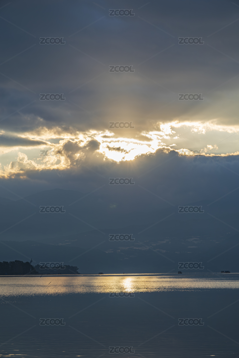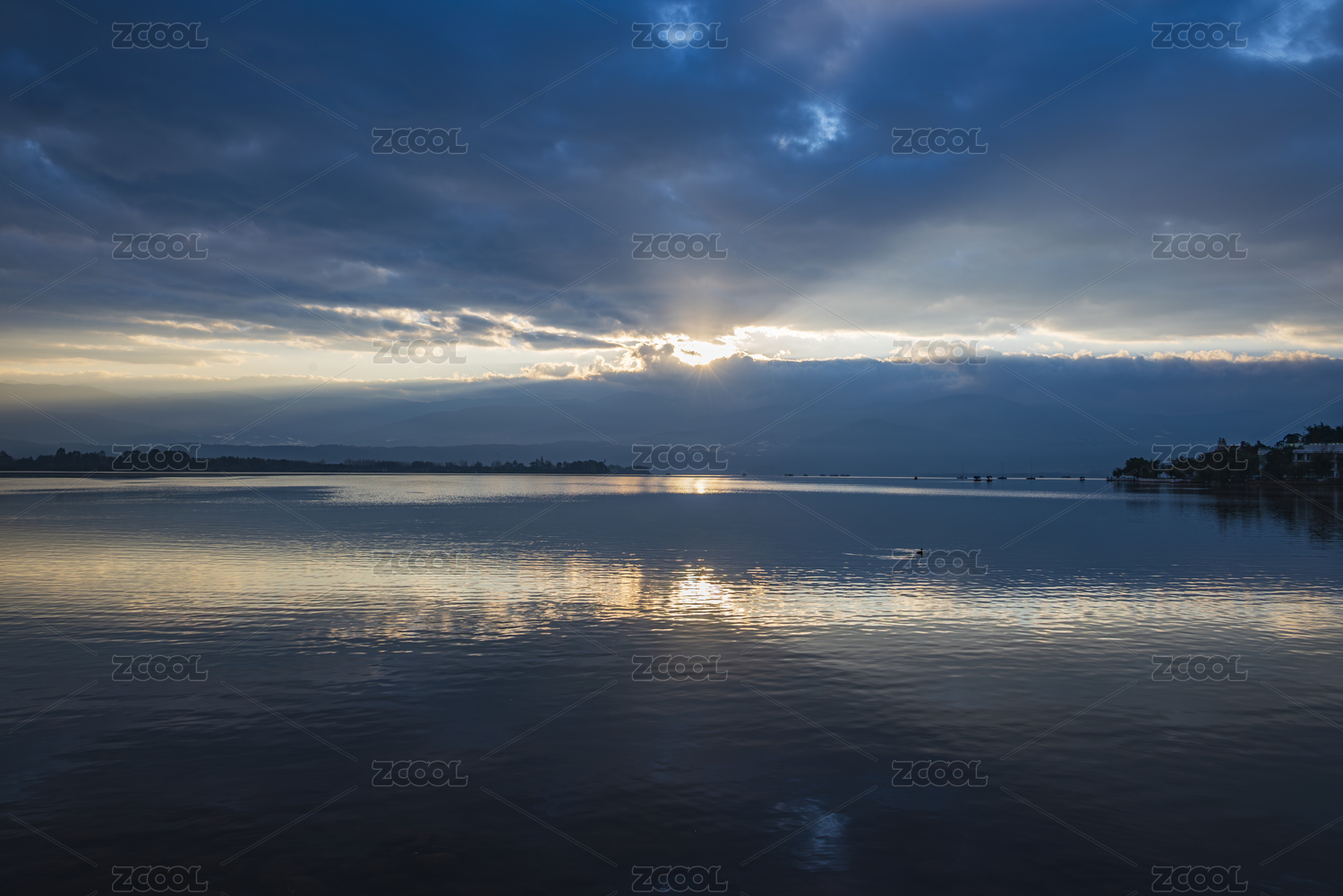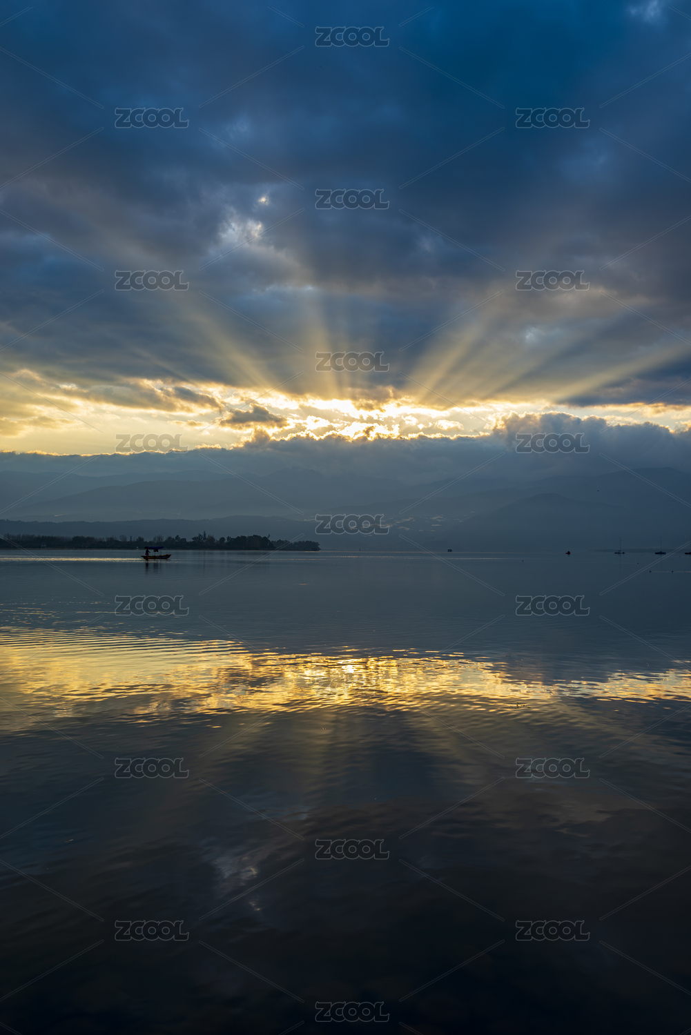 四川西昌邛海日出时分丁达尔光线映射湖面